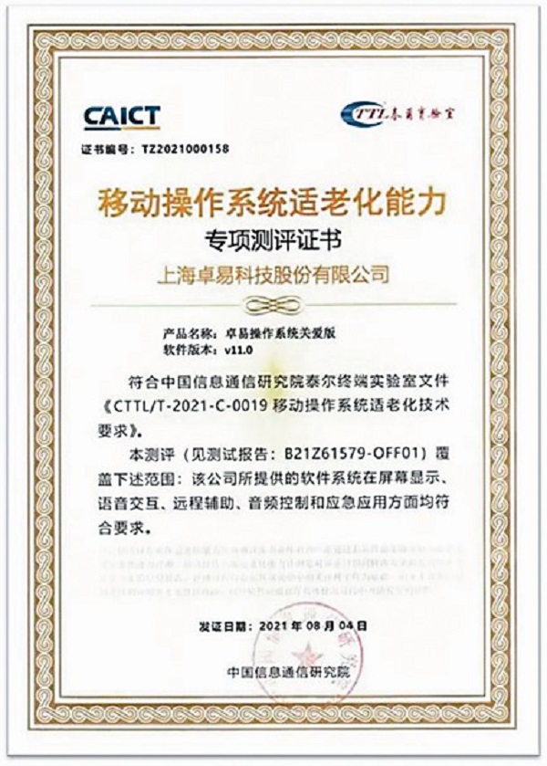 中國消費者報北京訊(記者武曉莉)日前,中國信息通信研究院(以下簡稱“中國信通院”)泰爾終端實驗室向上海卓易科技股份有限公司的卓易操作系統(tǒng)關(guān)愛版頒發(fā)了“移動操作系統(tǒng)適老化能力專項測評證書”,這是業(yè)界首張面向移動操作系統(tǒng)適老化能力的專項測評證書。