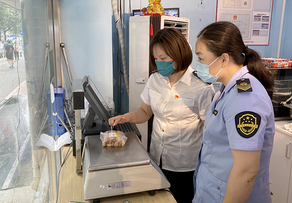 北京市豐臺區(qū)市場監(jiān)管局執(zhí)法人員在對已稱重的散裝食品查看定量是否準確。