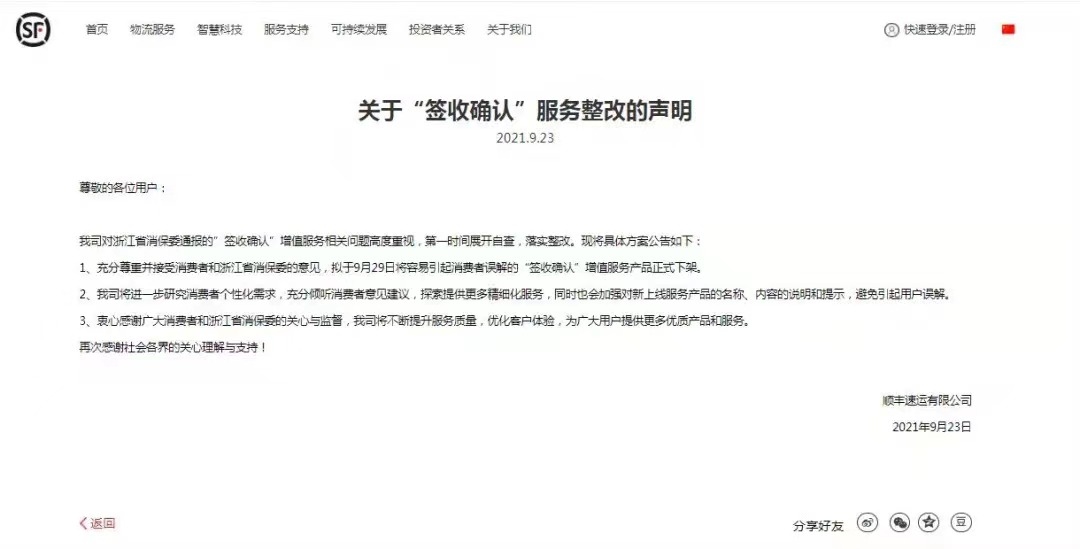 中國消費(fèi)者報(bào)訊 針對(duì)前期浙江省消保委點(diǎn)名順豐“簽收確認(rèn)”增值服務(wù)侵害消費(fèi)者合法權(quán)益一事,9月23日,順豐公司在其官網(wǎng)正式發(fā)布了一則整改聲明。