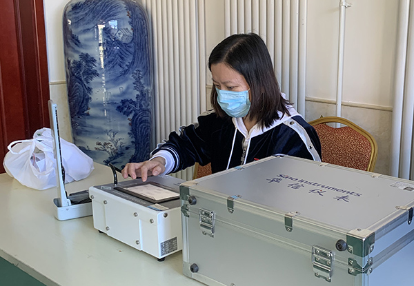 工作人員在給養(yǎng)老院檢測(cè)血壓計(jì)。