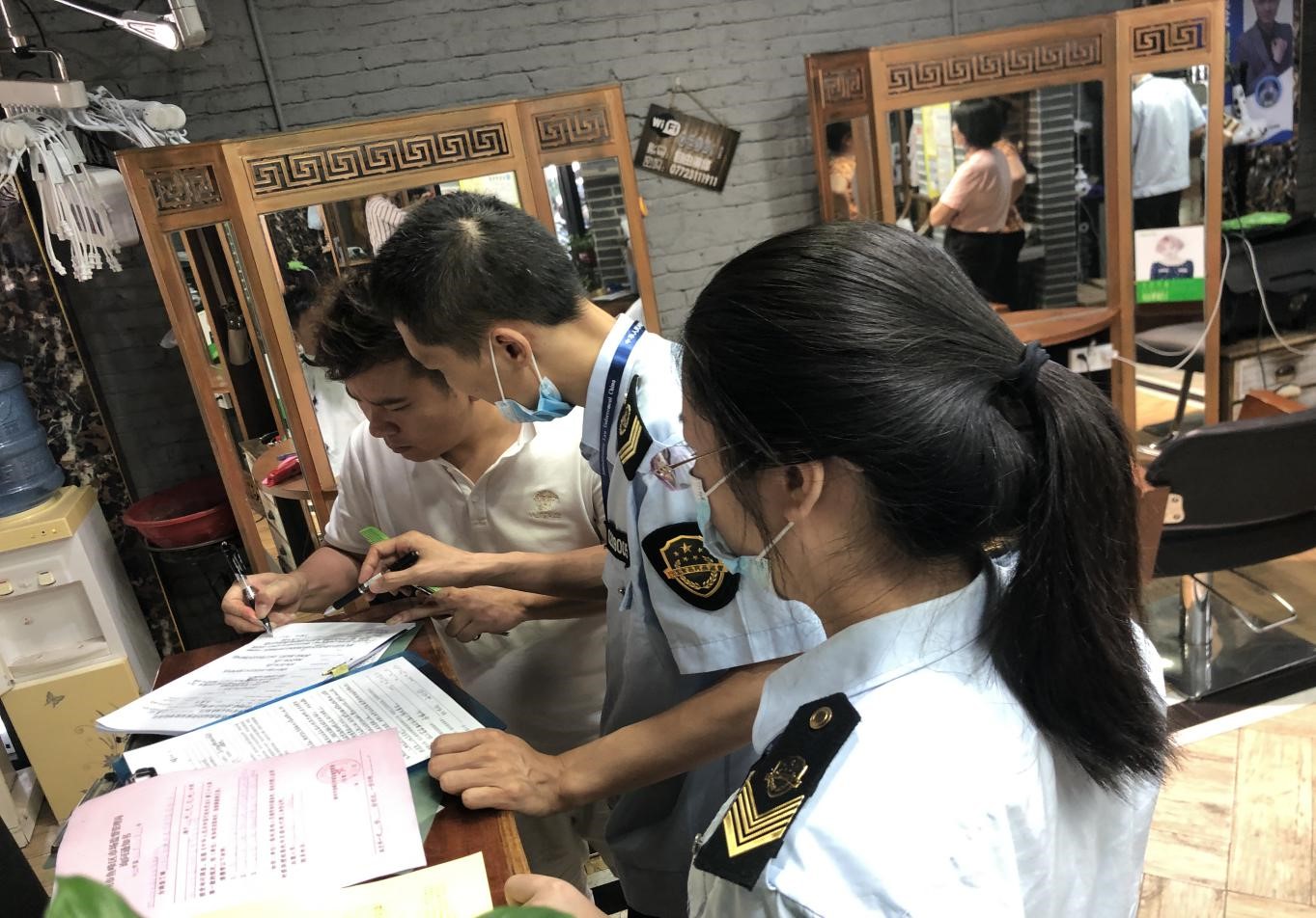 柳州市場(chǎng)監(jiān)管局執(zhí)法人員對(duì)美發(fā)店進(jìn)行檢查。吳唐陳/攝