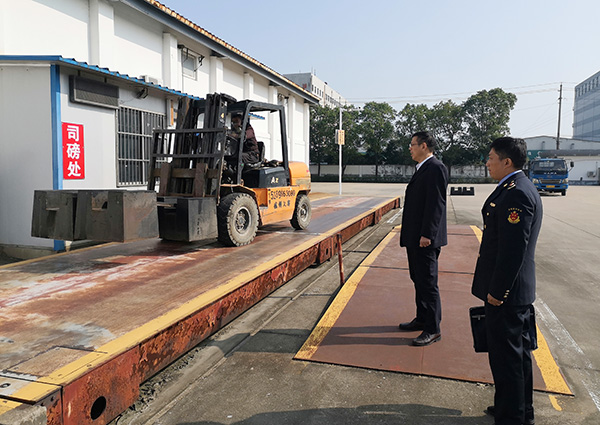 執(zhí)法人員在對秋糧收購電子汽車衡進行計量檢定。袁軍/攝