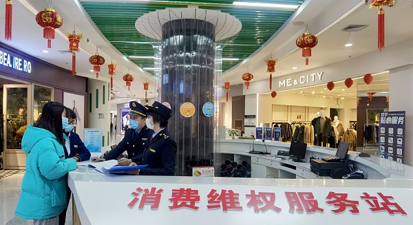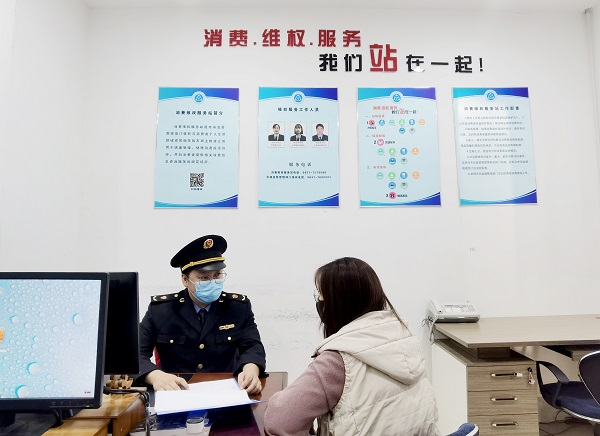 市場監(jiān)管人員在消費(fèi)維權(quán)服務(wù)站值守,為消費(fèi)者解決糾。