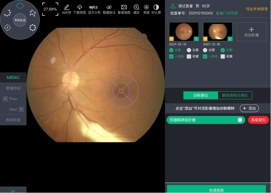 據(jù)介紹,眼科多病種輔助診斷AI是通過人工智能技術(shù),對眼部病變進(jìn)行輔助診斷的SaMD (Software as Medical Device)系統(tǒng)。這一系統(tǒng)通過先進(jìn)的醫(yī)療人工智能算法、標(biāo)準(zhǔn)化的閱片工具和完整的過程質(zhì)控,對眼底照片的特征和病灶尺寸、病變程度進(jìn)行訓(xùn)練和學(xué)習(xí)。AI模型基于數(shù)十位眼科專家對數(shù)萬張眼底照片的判讀、圈點(diǎn)、標(biāo)注,學(xué)習(xí)專家在眼部疾病領(lǐng)域?qū)I(yè)的經(jīng)驗(yàn)和豐富的知識(shí),對眼部疾病進(jìn)行自動(dòng)識(shí)別,進(jìn)一步對多種眼部病變的診斷提供輔助依據(jù)。