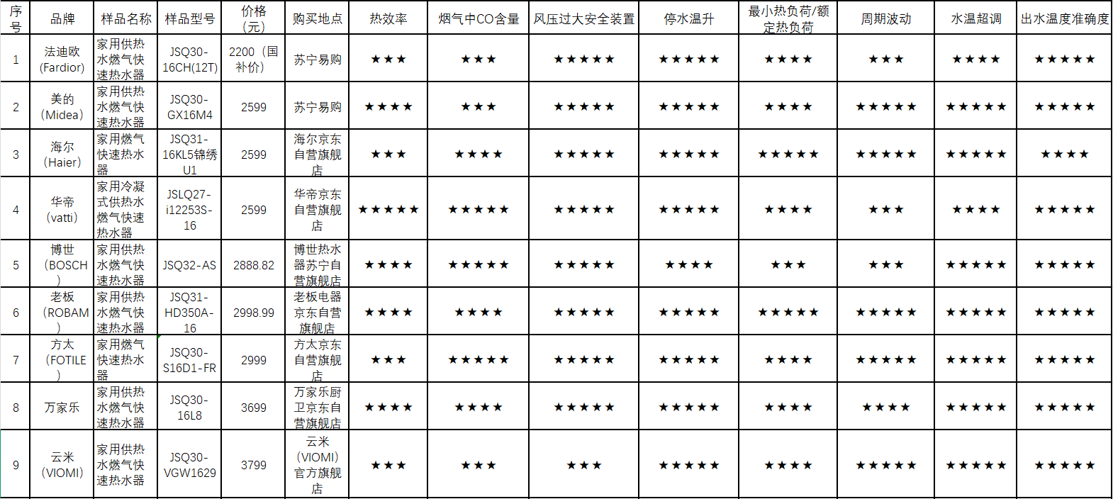 20款燃?xì)鉄崴鳂悠非闆r及比較試驗(yàn)結(jié)果一覽表(節(jié)選部分)(數(shù)據(jù)來源:中國消費(fèi)者協(xié)會(huì))