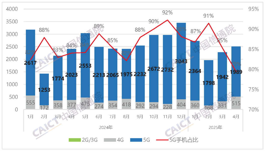 中國消費(fèi)者報(bào)北京訊(記者武曉莉)中國信息通信研究院日前發(fā)布4月國內(nèi)手機(jī)市場運(yùn)行分析報(bào)告。報(bào)告顯示,4月國內(nèi)手機(jī)出貨量2503.8萬部,其中5G手機(jī)占比79.4%。