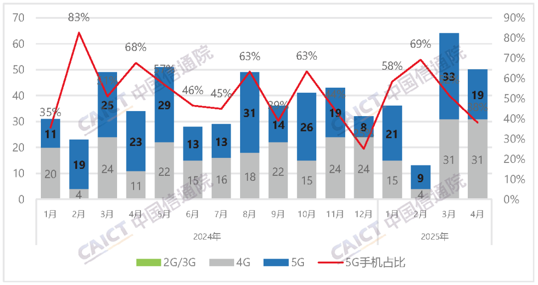 從國內(nèi)手機(jī)市場總體情況看,4月國內(nèi)市場手機(jī)出貨量2503.8萬部,同比增長4%,其中5G手機(jī)1988.9萬部,同比下降1.7%,占同期手機(jī)出貨量的79.4%。1—4月,國內(nèi)市場手機(jī)出貨量9470.8萬部,同比增長3.5%,其中5G手機(jī)8093.2萬部,同比增長5.6%,占同期手機(jī)出貨量的85.5%。