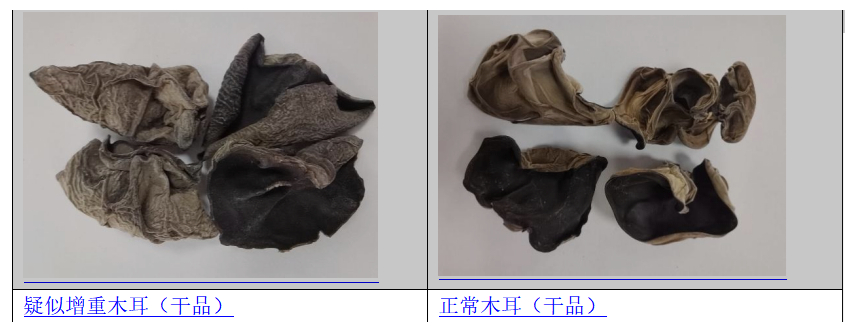 增重黑木耳手掂感覺重量大,手握感覺較僵硬;正常黑木耳大多手感輕,手握有刺痛感。同時,雖然用手捏握兩種木耳都可能會破碎,但增重黑木耳更易破碎為小塊。