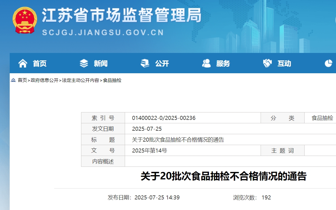近期,江蘇省市場監(jiān)督管理局組織食品安全抽檢,抽取食用油、油脂及其制品、飲料、炒貨食品及堅(jiān)果制品、水產(chǎn)制品、茶葉及相關(guān)制品、豆制品、肉制品、蔬菜制品、糖果制品、方便食品、薯類和膨化食品、餐飲食品、酒類、罐頭、乳制品、糕點(diǎn)、食用農(nóng)產(chǎn)品、速凍食品、調(diào)味品和淀粉及淀粉制品等20大類食品1631批次樣品,檢出其中調(diào)味品、餐飲食品、食用農(nóng)產(chǎn)品、糕點(diǎn)、薯類和膨化食品、炒貨食品及堅(jiān)果制品等6大類食品20批次樣品不合格,詳細(xì)信息見附表。