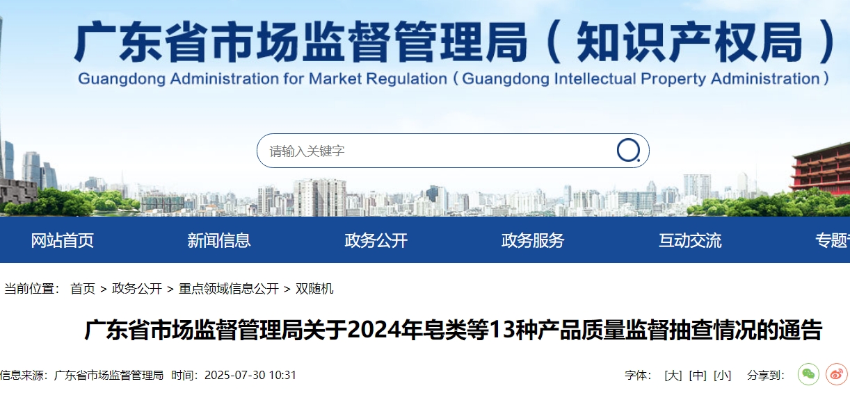 根據(jù)《中華人民共和國產(chǎn)品質(zhì)量法》《產(chǎn)品質(zhì)量監(jiān)督抽查管理暫行辦法》《廣東省產(chǎn)品質(zhì)量監(jiān)督條例》等相關(guān)規(guī)定,2024年,廣東省市場監(jiān)督管理局組織開展皂類、家用清潔劑、洗衣粉、衣料用液體洗滌劑、家用衛(wèi)生殺蟲用品、洗發(fā)液/膏、消毒劑、牙刷、空氣清新劑、車用美容產(chǎn)品、洗衣凝珠、地板清潔劑、洗手液等13種產(chǎn)品質(zhì)量監(jiān)督抽查。現(xiàn)將抽查情況通告如下。
