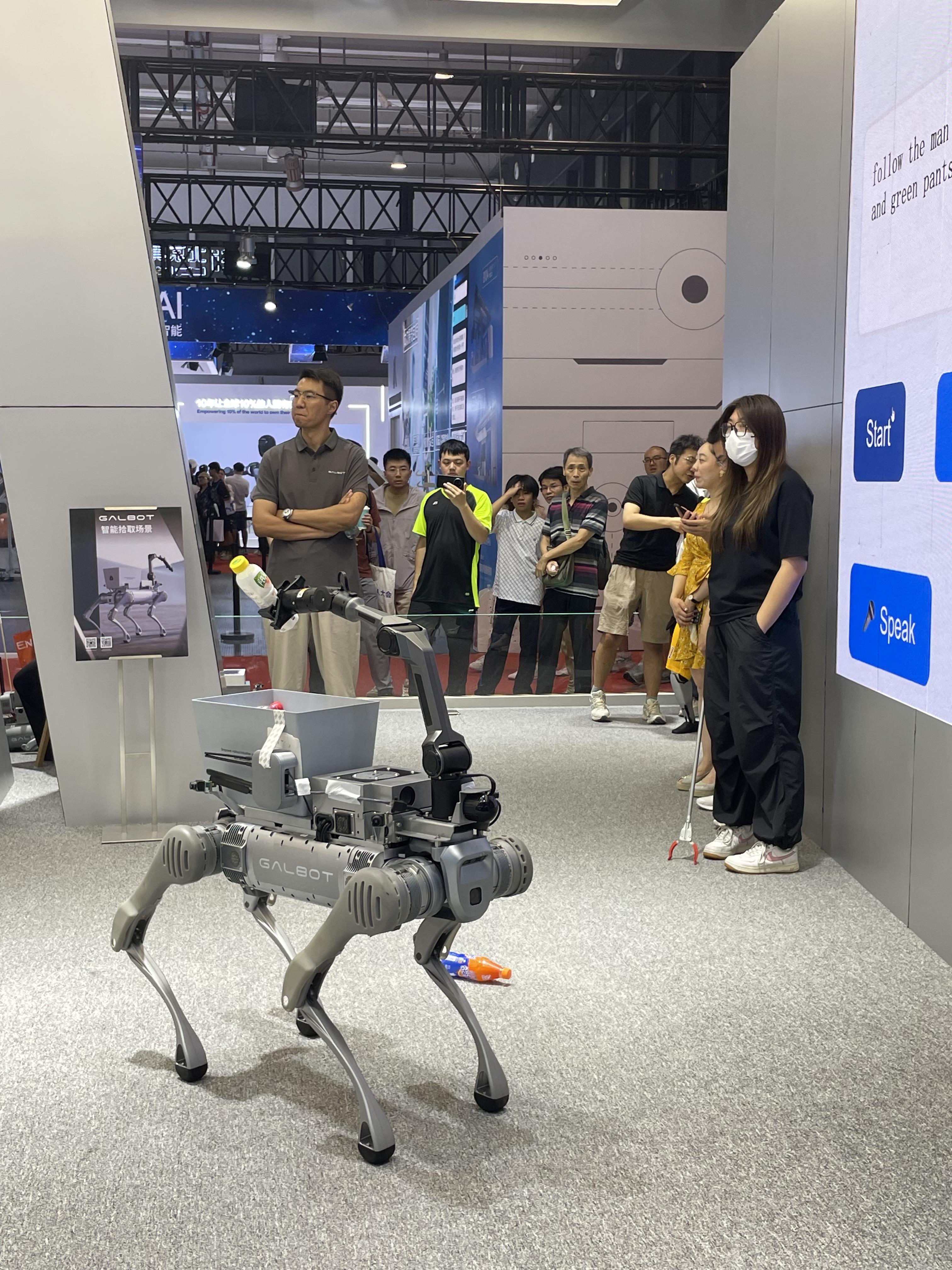 另一邊,在銀河通用的展臺,搭載“第五只手”的機(jī)器狗已經(jīng)開始“干活”了,能夠自主精準(zhǔn)識別被丟棄在地上的水瓶,并迅速將其撿起。