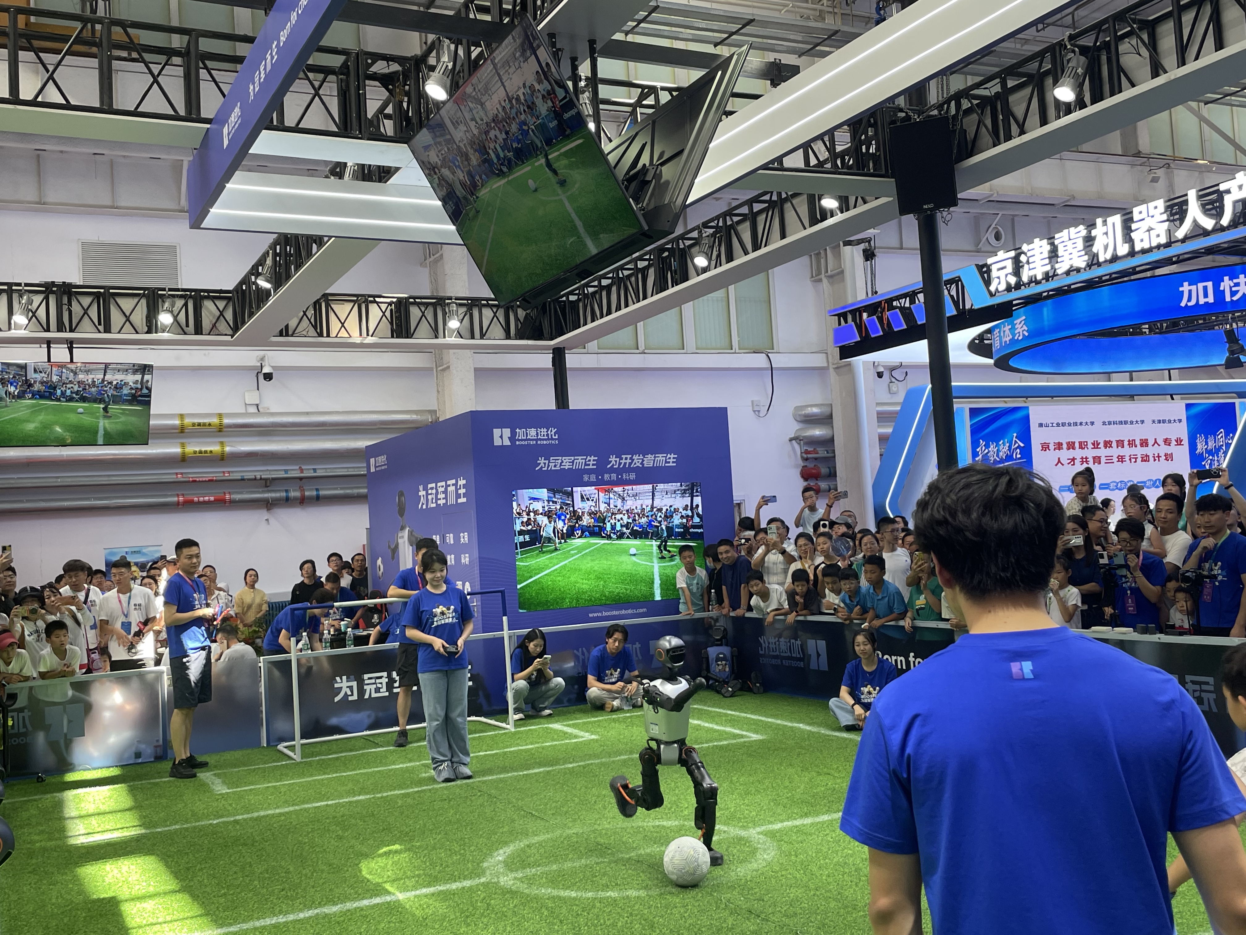 有家企業(yè)搭建了個(gè)小型足球場地,加速進(jìn)化機(jī)器人小巧靈活的身影在綠茵場上來回穿梭,傳球、運(yùn)球一氣呵成,吸引大批觀眾圍觀打卡,也讓人直觀感受機(jī)器人競技的獨(dú)特魅力。