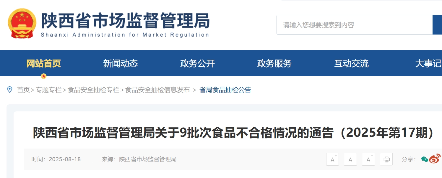 近期,陜西省市場監(jiān)督管理局組織的食品安全監(jiān)督抽檢中,檢出9批次樣品不合格。產品抽檢結果可查詢https://spcjsac.gsxt.gov.cn/。