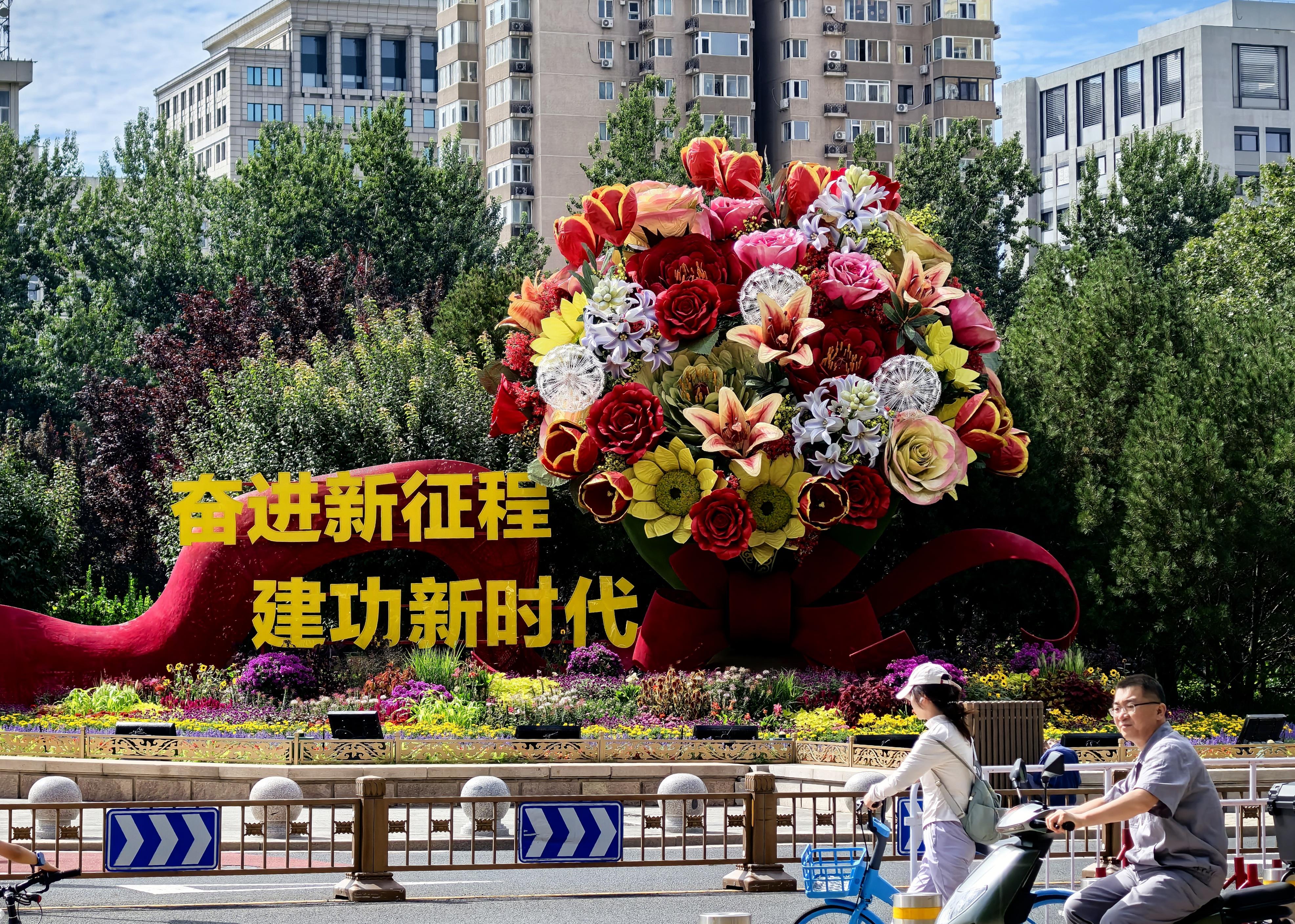 長安街沿線西單東北角的“繁榮發(fā)展”花壇。