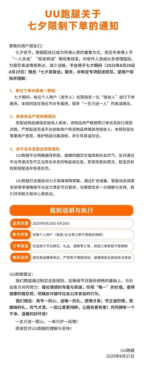 中國消費(fèi)者報(bào)北京訊(記者孫蔚)8月27日,UU跑腿發(fā)布了一則特殊的七夕限制通知,宣布將在8月28日至29日兩天,推出名為“七夕真愛送”的嚴(yán)格配送規(guī)范,其中最引人矚目的條款要求“單日下單對象唯一限制”,即每位用戶在節(jié)日期間只能指定一位接收人享受服務(wù)。這一圍繞專一理念設(shè)計(jì)的節(jié)日服務(wù)引起廣泛討論。