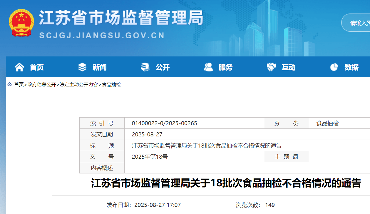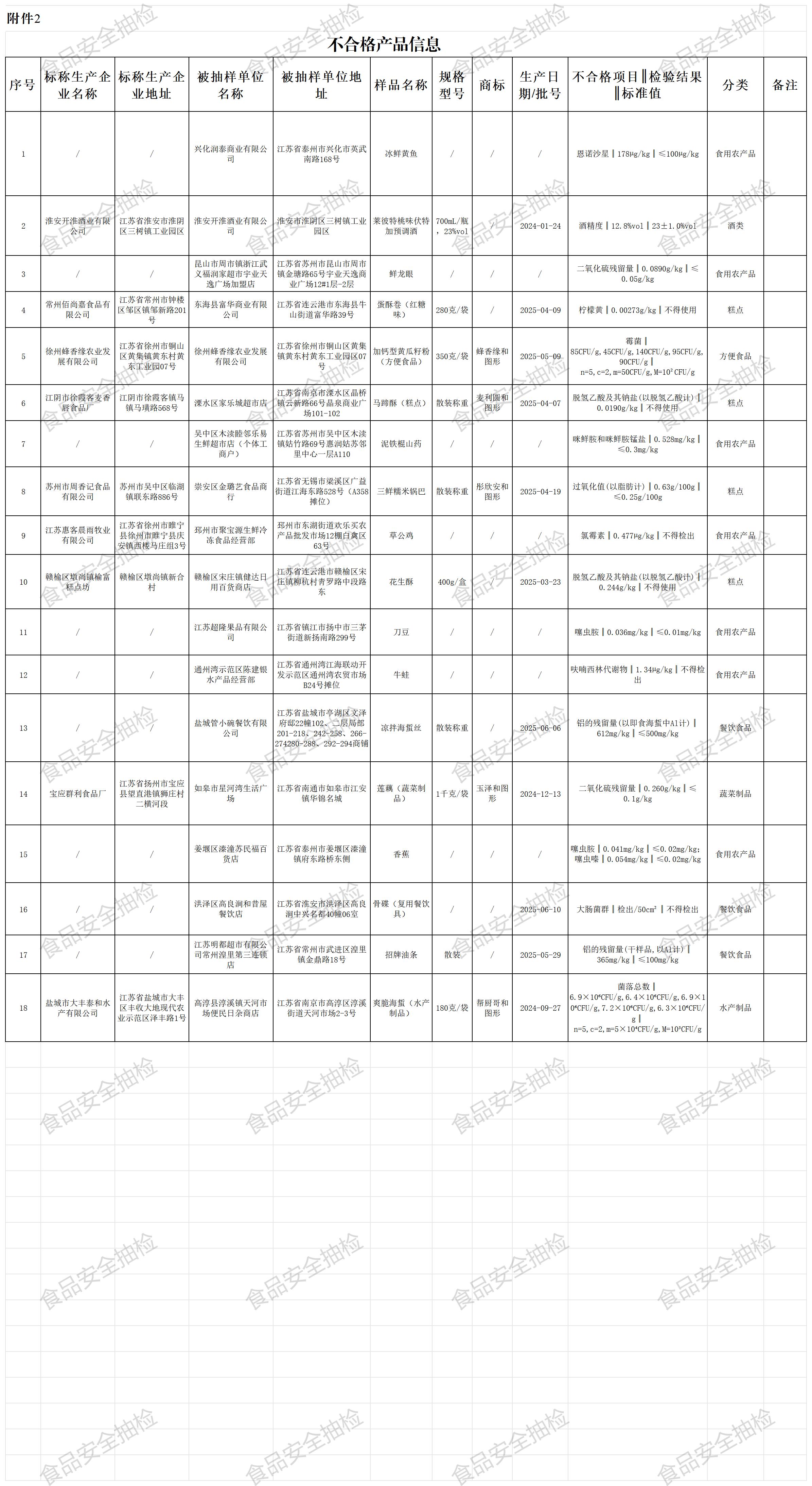近期,江蘇省市場監(jiān)督管理局組織食品安全抽檢,抽取食用農(nóng)產(chǎn)品、調(diào)味品、方便食品、酒類、餐飲食品、糕點、蔬菜制品、茶葉及相關(guān)制品、水產(chǎn)制品、罐頭及食糖等11大類食品849批次樣品,檢出其中食用農(nóng)產(chǎn)品、糕點、餐飲食品、方便食品、酒類、蔬菜制品及水產(chǎn)制品等7大類食品18批次樣品不合格,詳細(xì)信息見附表。