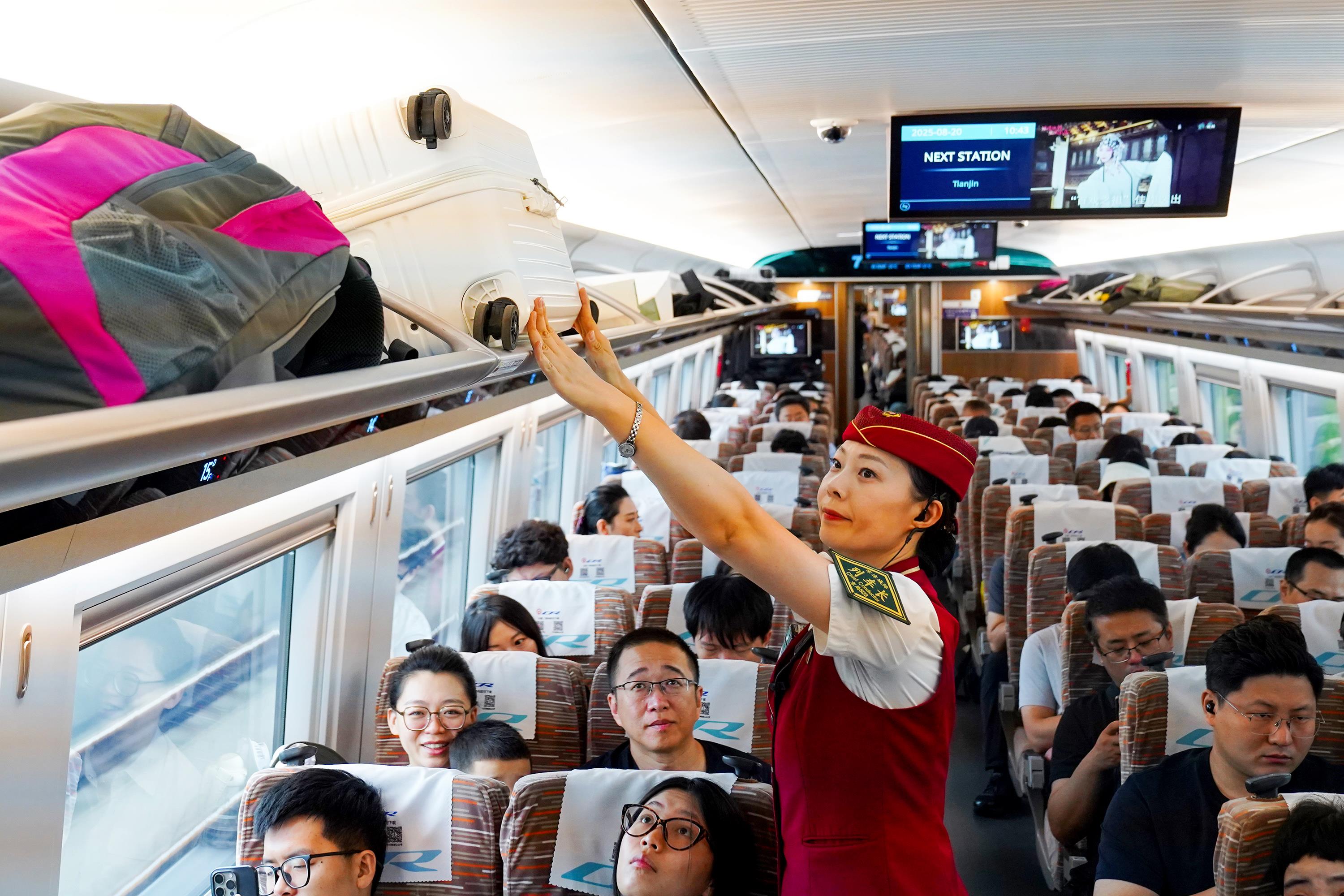 列車(chē)工作人員為旅客安置行李。