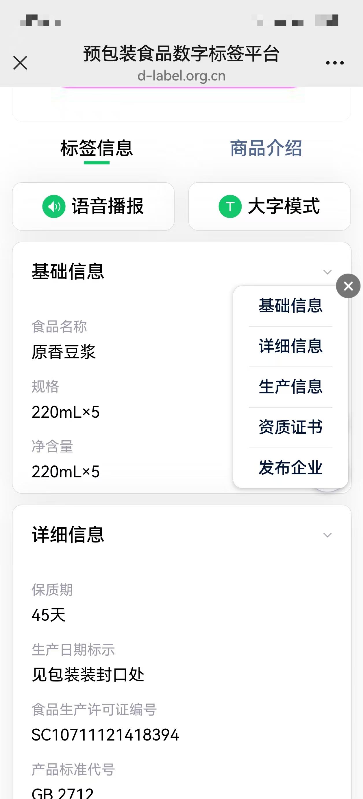 豆?jié){產(chǎn)品數(shù)字標簽中有“語音播報”功能和“大字模式”。記者截圖