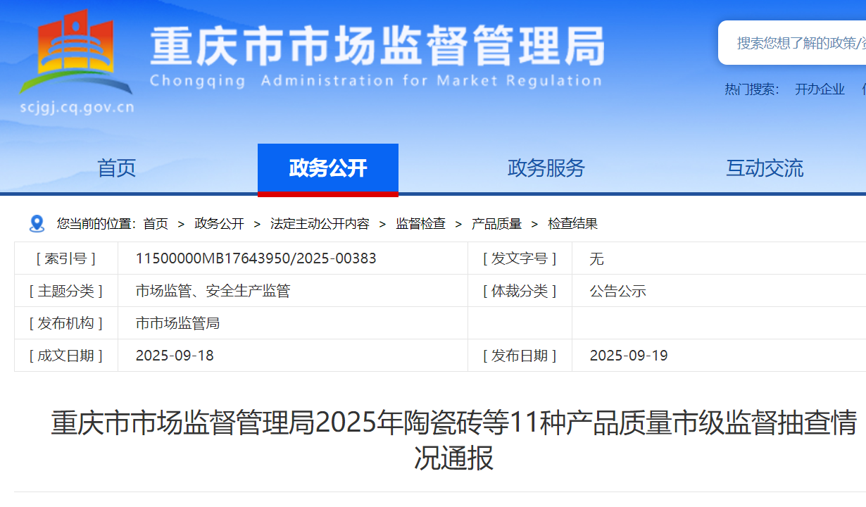 2025年,重慶市市場監(jiān)督管理局組織陶瓷磚等11種產(chǎn)品質(zhì)量監(jiān)督抽查?,F(xiàn)將抽查情況通報(bào)如下: