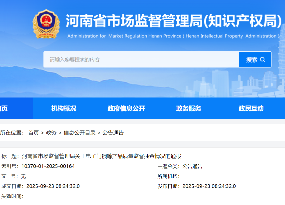 近期,河南省市場(chǎng)監(jiān)督管理局組織開展了電子門鎖等產(chǎn)品質(zhì)量監(jiān)督抽查?,F(xiàn)將抽查情況通報(bào)如下: