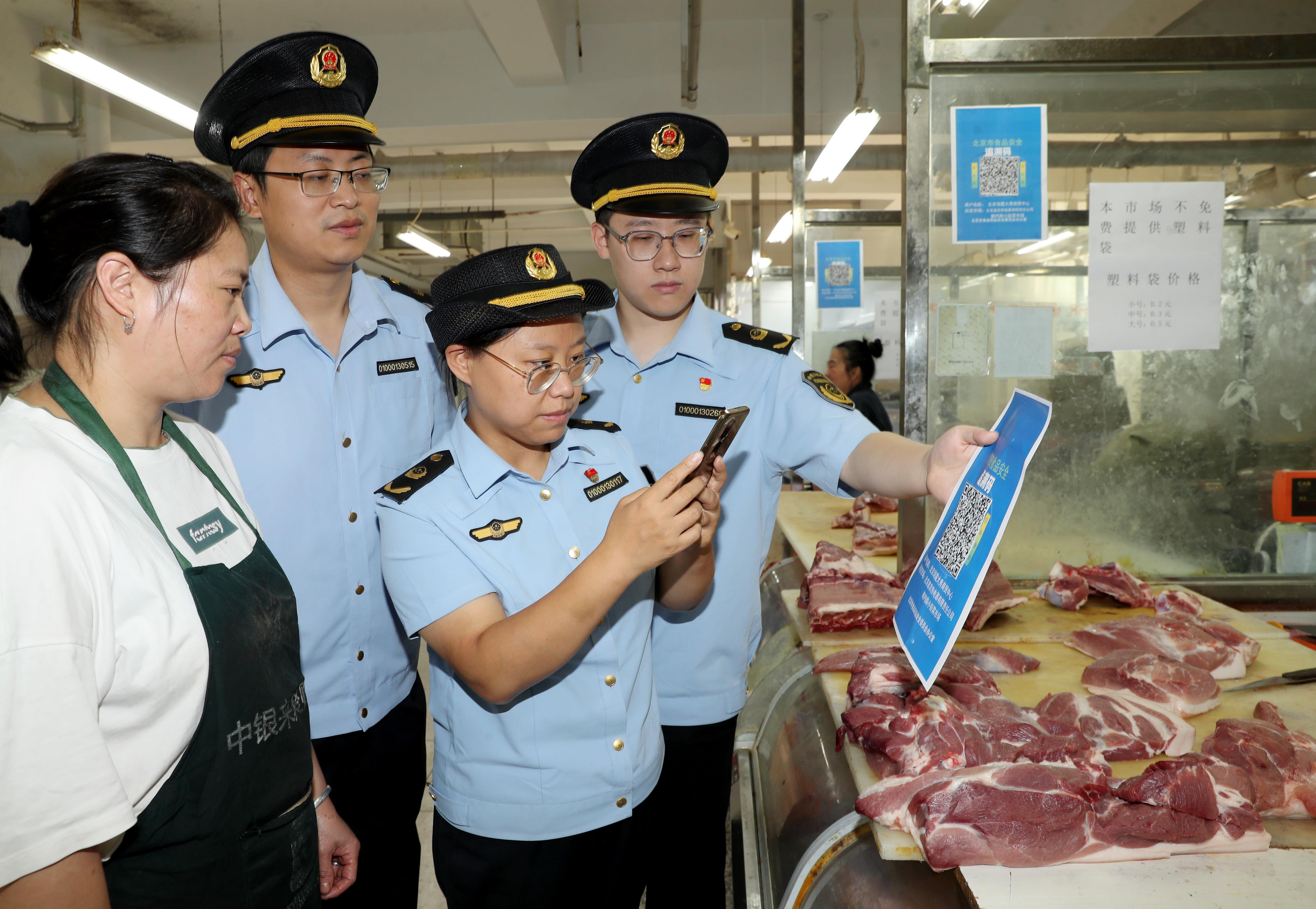 國慶中秋將至,為保障首都居民歡度佳節(jié),北京市東城區(qū)市場監(jiān)管局對農(nóng)貿(mào)市場開展節(jié)前檢查,重點關(guān)注畜禽肉、米面油、瓜果蔬菜、月餅糕點等居民常備節(jié)日食品,并通過掃描“追溯碼”檢查市場內(nèi)豬肉產(chǎn)品的追溯信息。
