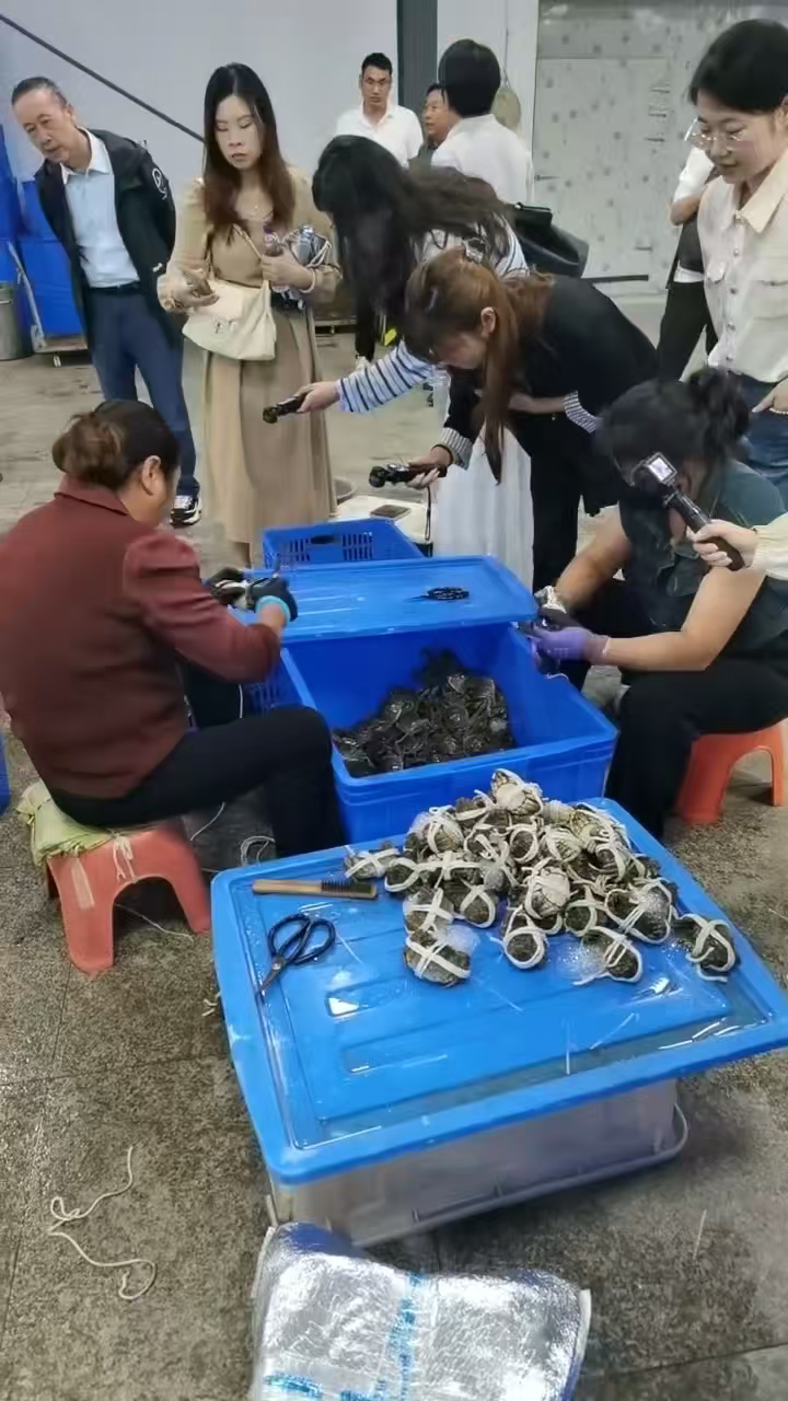 宿遷霸王蟹京東基地,工作人員正在捆蟹。桑雪騏/攝