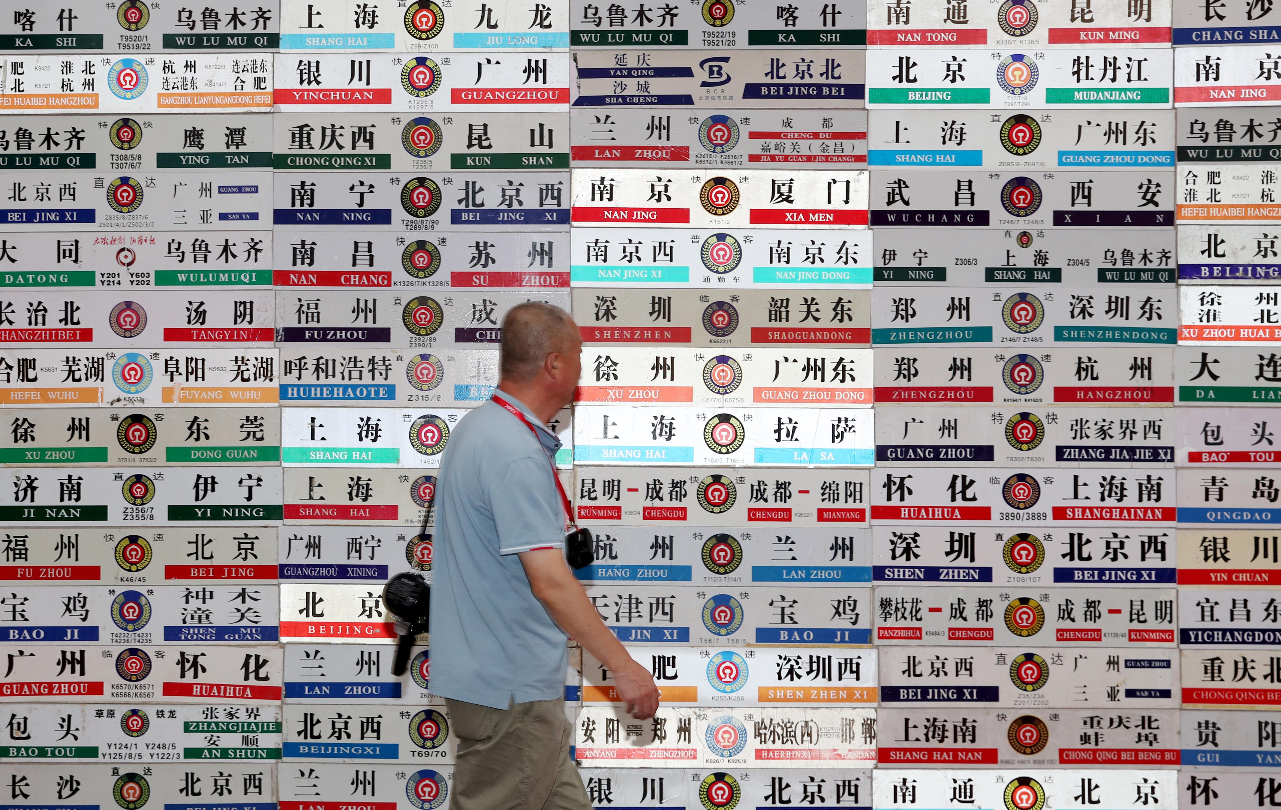 展示的全國各地的火車站牌。