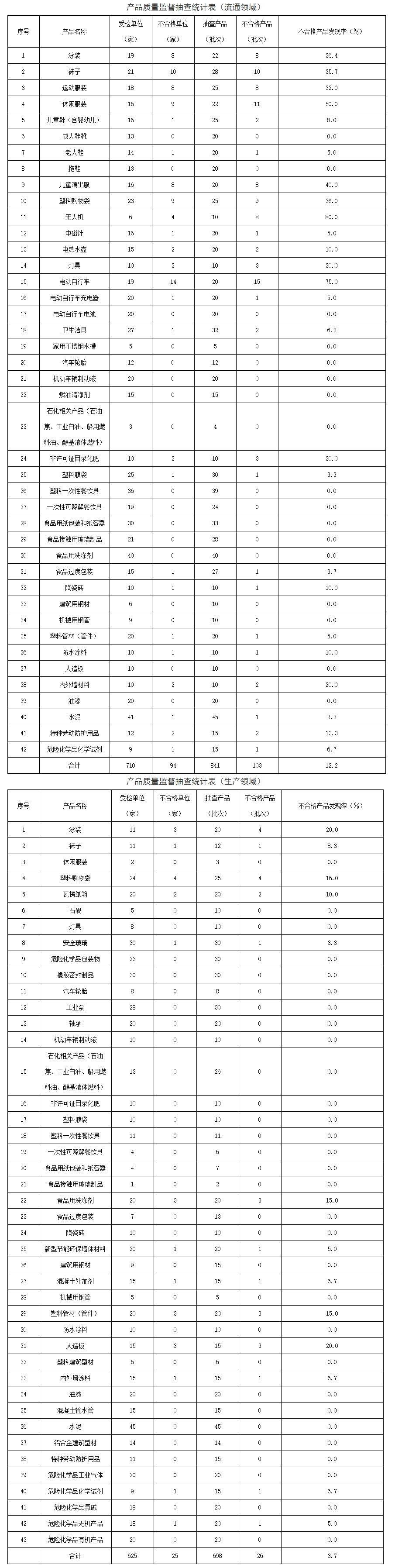 本次共抽查泳裝等58種產(chǎn)品1539批次,其中抽查經(jīng)銷單位710家841批次,抽查生產(chǎn)企業(yè)625家698批次。經(jīng)檢驗(yàn),經(jīng)銷單位94家103批次產(chǎn)品不合格,不合格發(fā)現(xiàn)率為12.2%,生產(chǎn)企業(yè)25家26批次產(chǎn)品不合格,不合格發(fā)現(xiàn)率為3.7%。具體如下: