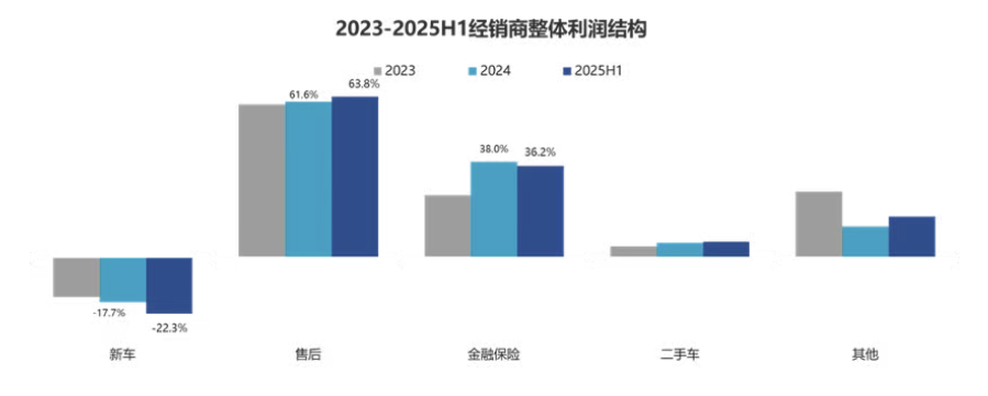 《報告》顯示,在經銷商的毛利構成中,新車、售后和金融保險的毛利貢獻分別為-22.3%、-63.8%和-36.2%。當下,售后服務毛利貢獻略有增加,比如售后服務、汽車裝飾等,而依靠高返傭汽車分期策略獲得短暫毛利增長的金融保險較以往出現(xiàn)明顯下降。上半年,新車金融滲透率由2024年的69.1%降至62.8%,呈現(xiàn)持續(xù)回落趨勢。這一變化主要源于兩方面因素:一方面是多家商業(yè)銀行暫?;蛘{整汽車消費金融產品,市場金融供給收縮;另一方面是價格敏感型客戶需求減弱,導致金融滲透率下降。