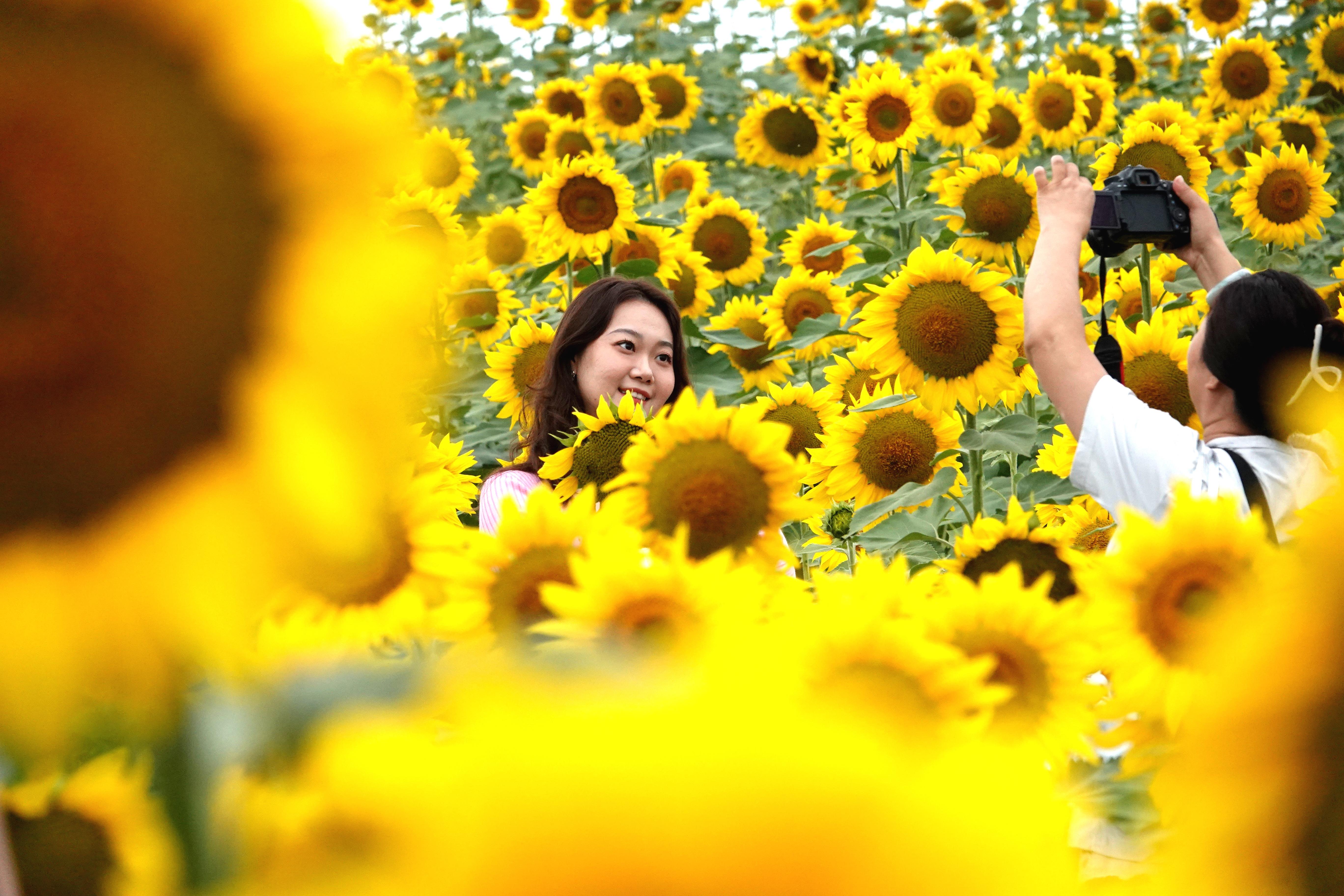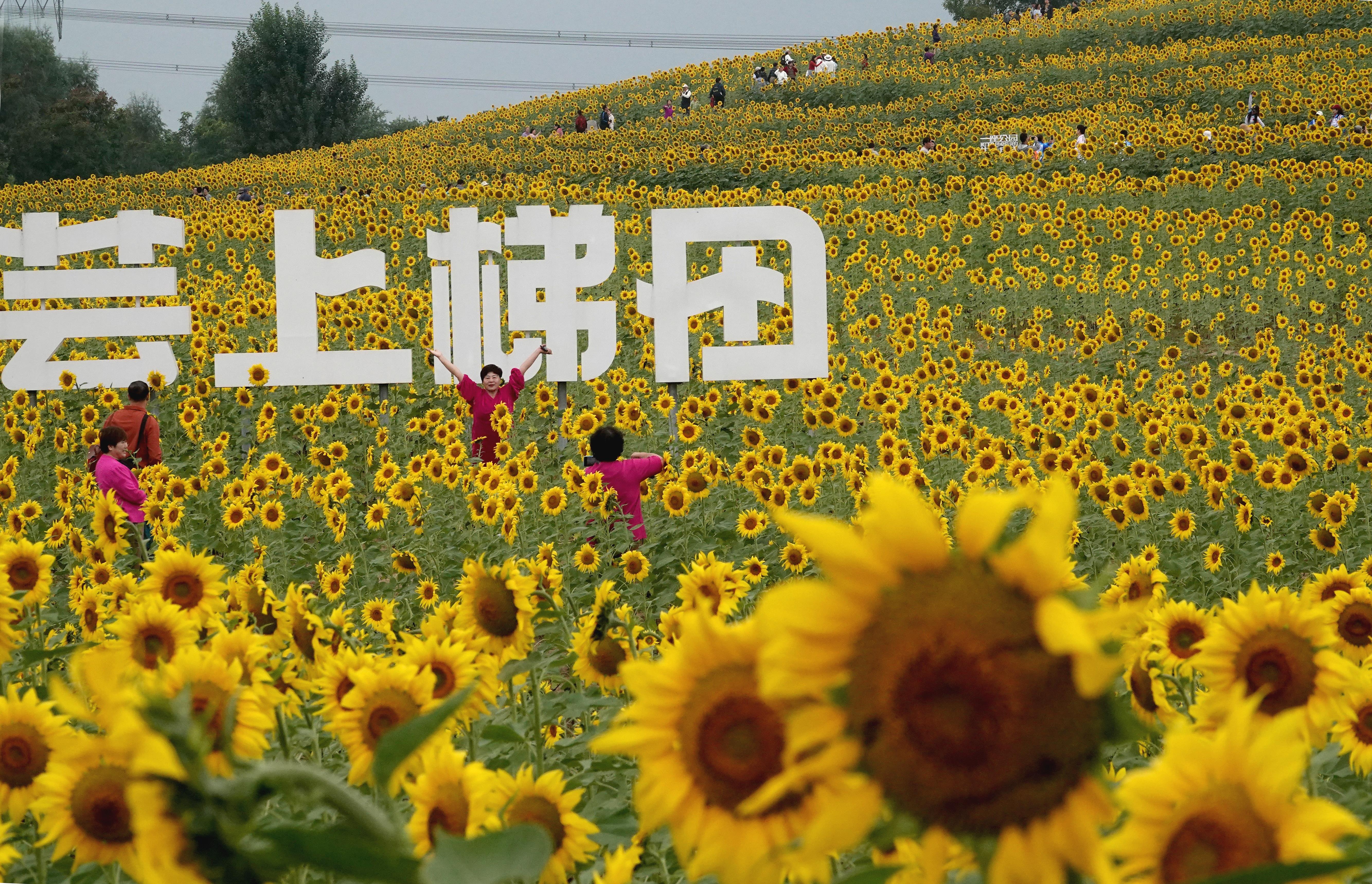 近日,坐落在北京溫榆河公園西園的“蕓上梯田”景區(qū)向日葵盛開,宛如金色的海洋,吸引了不少市民、游客置身花田打卡拍照。