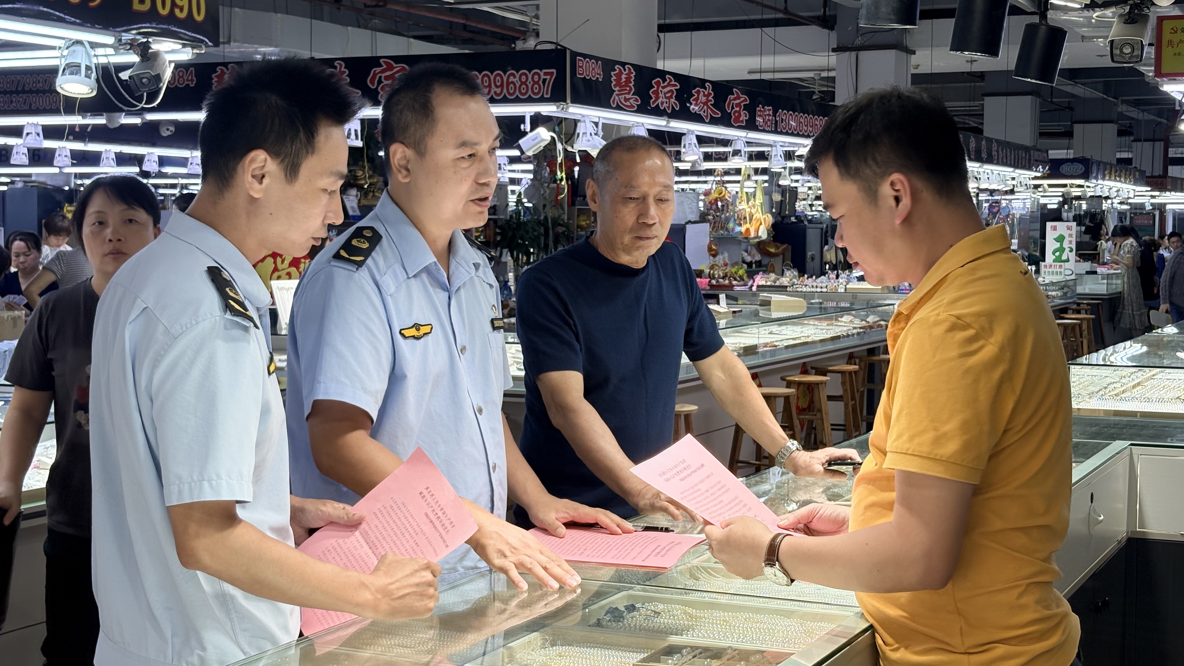 執(zhí)法人員給珍珠城經(jīng)營戶宣講誠信經(jīng)營承諾的內(nèi)容和要求。北海市市場監(jiān)管局供圖