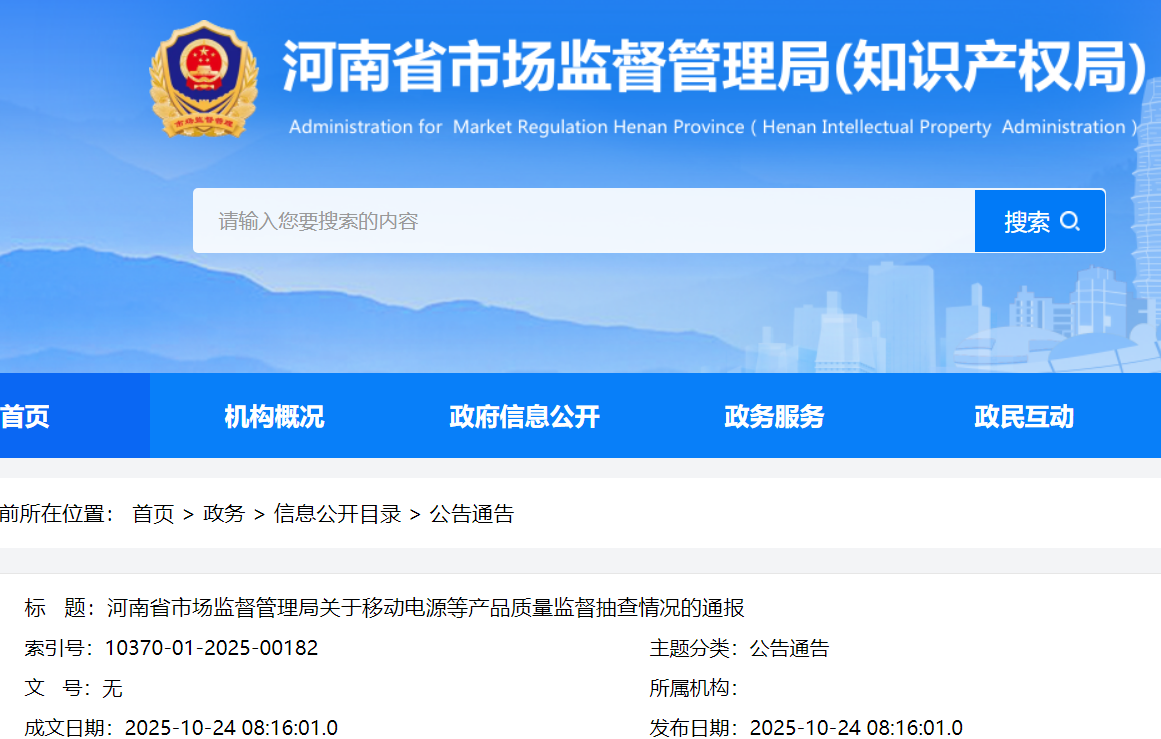 近期,河南省市場監(jiān)督管理局組織開展了移動電源等產(chǎn)品質(zhì)量監(jiān)督抽查?,F(xiàn)將抽查情況通報如下: