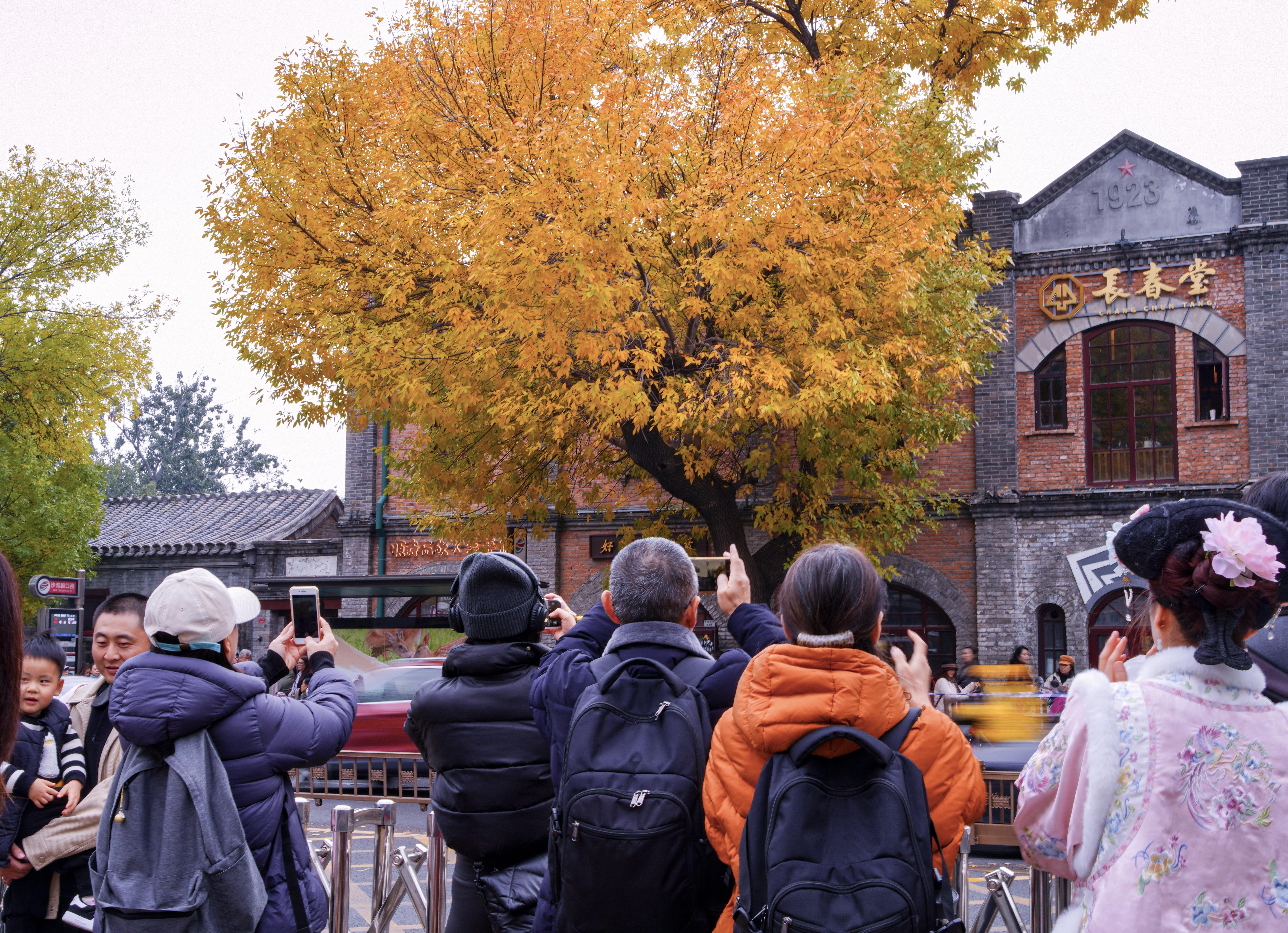 五四大街的長春堂前,游客在“網(wǎng)紅”白蠟樹下拍照。
