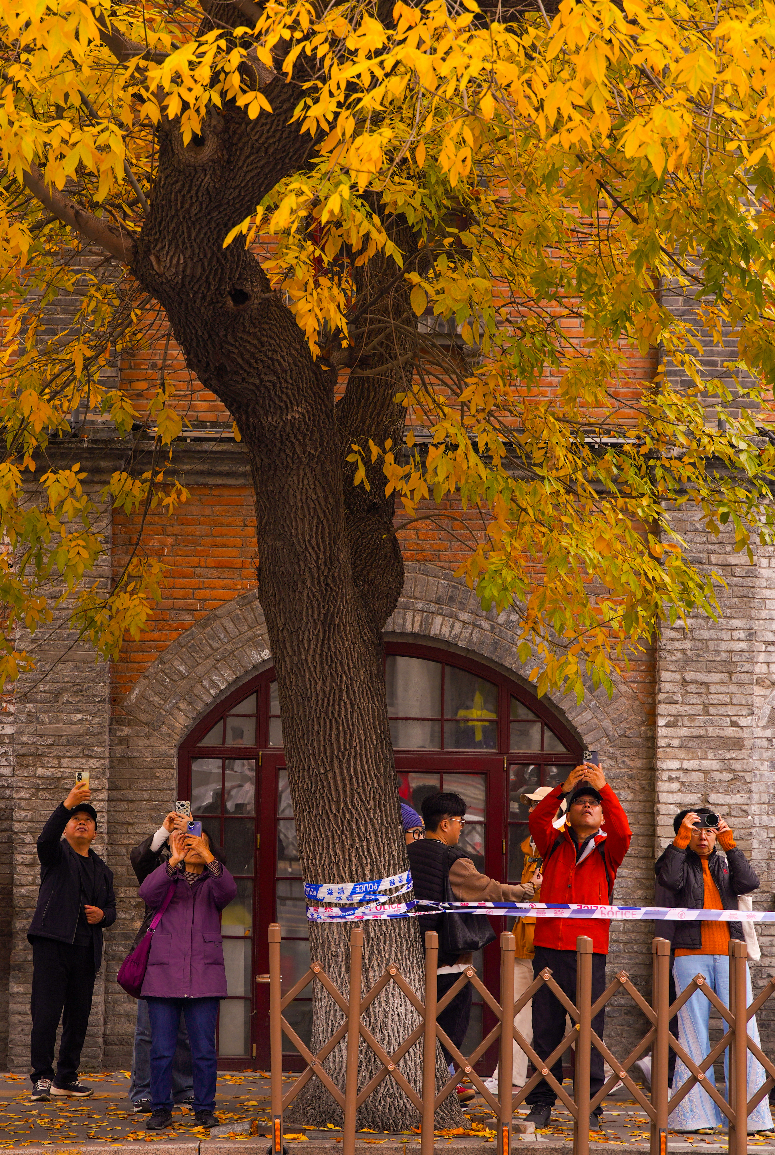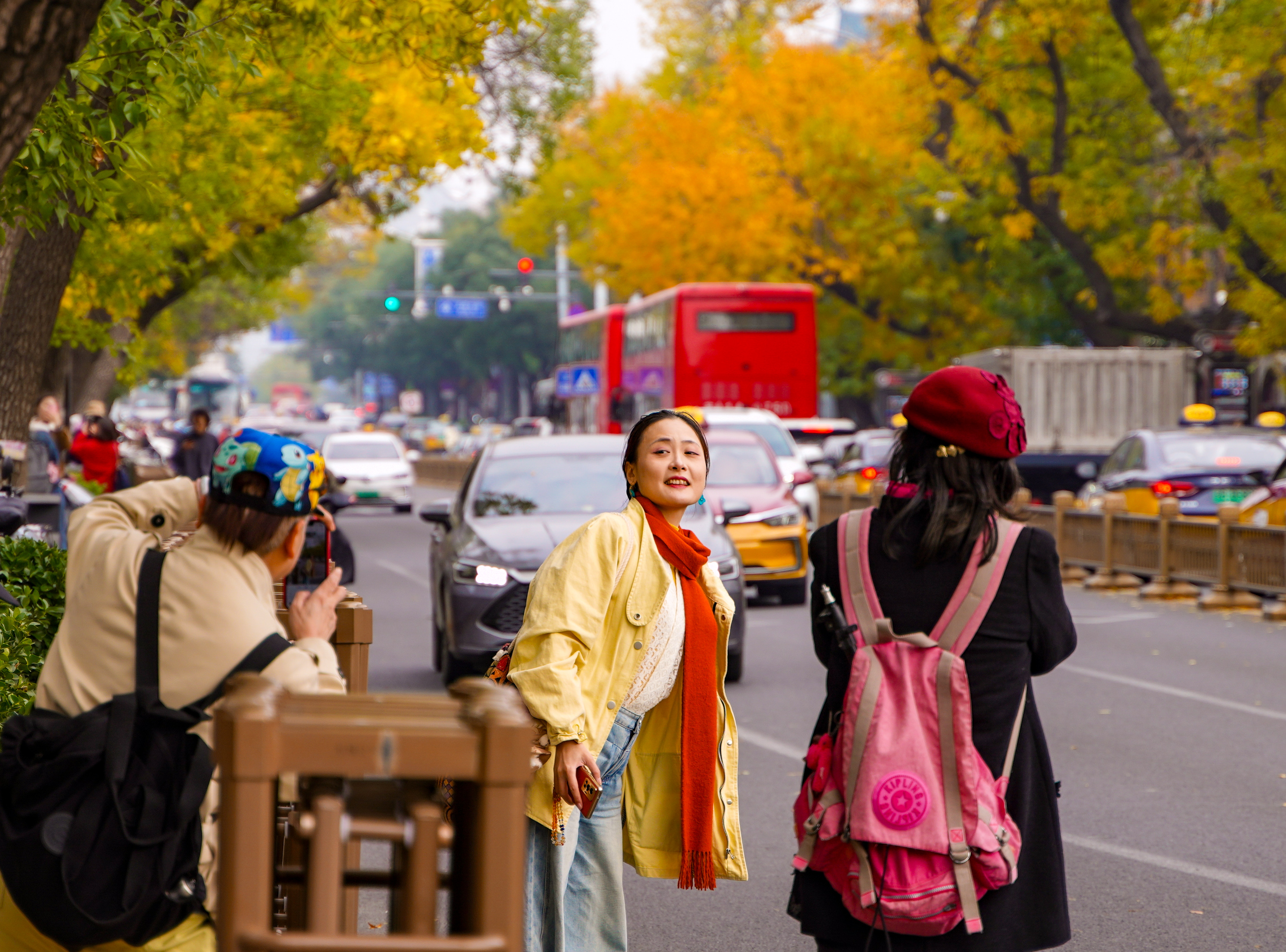 近日,隨著天氣的變化,北京五四大街上的白蠟樹悄悄換上金裝,與附近的歷史建筑相映成趣,吸引了眾多游客拍照打卡,感受北平之秋。