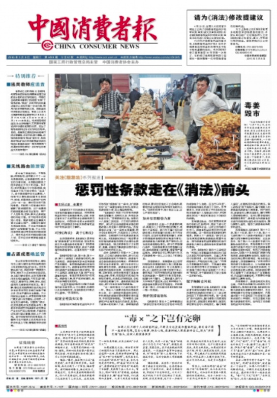 同時,報社對當時公布的《消費者權(quán)益保護法修正案(草案)》進行了深入的研究和討論,從中篩選出與原《消法》相比有明顯改進的亮點條款,結(jié)合歷年采訪報道中積累的對原《消法》在實踐中出現(xiàn)的難以適應(yīng)的問題的認識,列出了7個可在《消法》修訂過程中應(yīng)予改進的點,采訪了國內(nèi)對于消費者權(quán)益保護法律有深入研究的專家,寫成7篇稿件。其中,《懲罰性賠償還應(yīng)加碼》通過采訪,呼吁加大懲罰性賠償?shù)牧Χ?,提高保底賠付的額度;《舉證責任倒置要擴大適用范圍》通過一位律師修手機經(jīng)歷的實際事例,呼吁《消費者權(quán)益保護法修正案(草案)》中提出的耐用商品、服務(wù)舉證責任倒置應(yīng)進一步擴展適用范圍;《公益訴訟主體應(yīng)下探外擴》通過地方消費者組織對公益訴訟的實踐探索,呼吁應(yīng)將有權(quán)提起公益訴訟的單位進一步下放、擴大。報社還發(fā)起“請為《消法》修改提建議”活動,收到來自全國各地讀者的建議100多條。通過綜合讀者建議和專家意見,《中國消費者報》歸納了9條立法建議,向全國人大常委會法制工作委員會遞送。