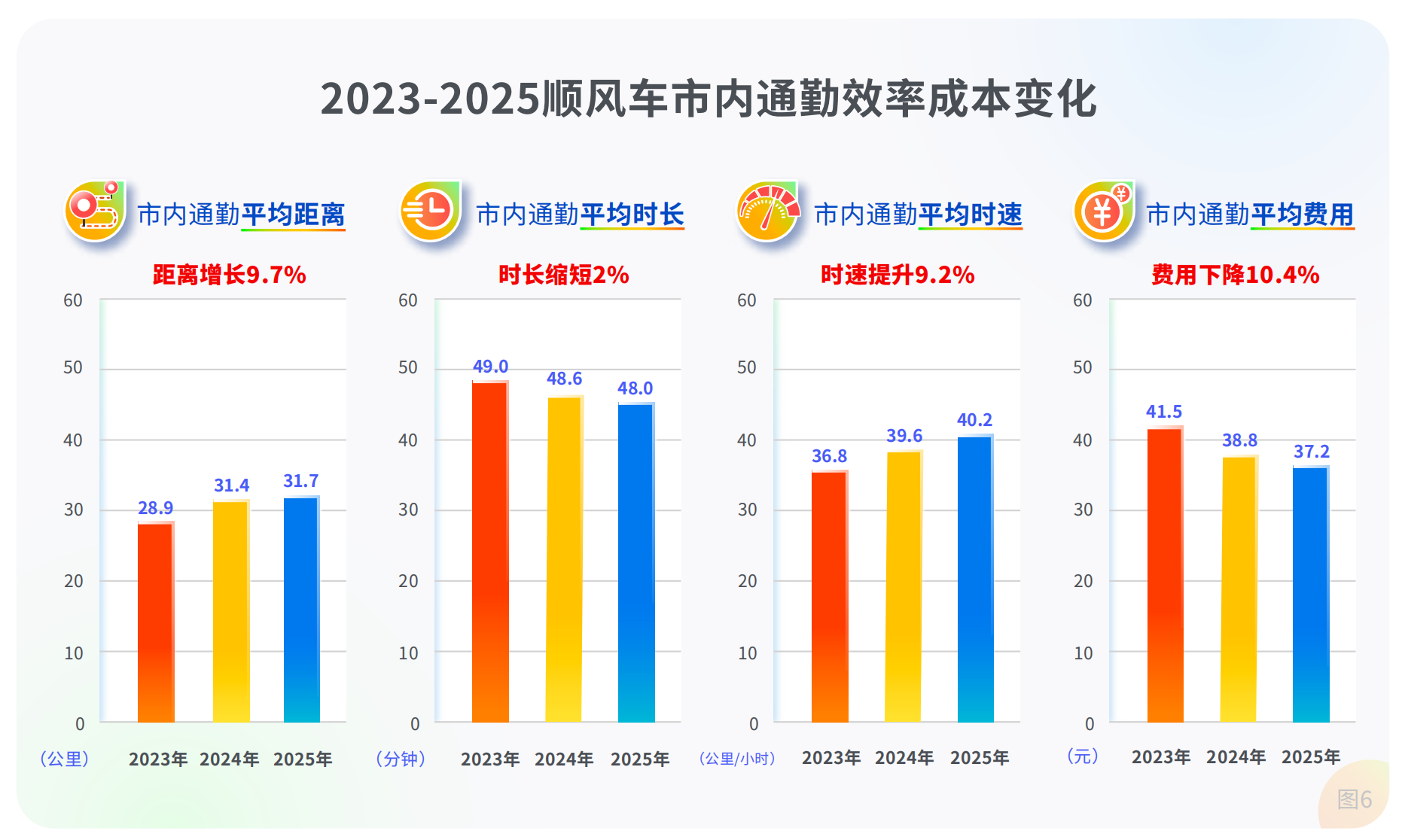 《報(bào)告》顯示,順風(fēng)車通勤效率連續(xù)三年提升,通勤成本連續(xù)三年下降。2025年,順風(fēng)車市內(nèi)及跨城通勤時(shí)速分別40.2公里和56公里,相比2023年分別提升了9.2%和14.5%,市內(nèi)及跨城通勤平均費(fèi)用分別為37.2元和100.3元,分別下降了10.4%和5.8%。