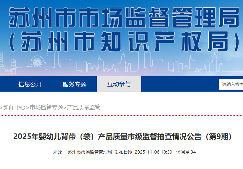 根據(jù)《中華人民共和國產(chǎn)品質(zhì)量法》、《產(chǎn)品質(zhì)量監(jiān)督抽查管理暫行辦法》、《江蘇省省級產(chǎn)品質(zhì)量監(jiān)督抽查工作規(guī)范》和《中華人民共和國政府信息公開條例》等規(guī)定,蘇州市市場監(jiān)督管理局近期委托大加利(太倉)質(zhì)量技術(shù)檢測中心有限公司對嬰幼兒背帶(袋)產(chǎn)品質(zhì)量實(shí)施了市級監(jiān)督抽查并將有關(guān)情況公告如下: