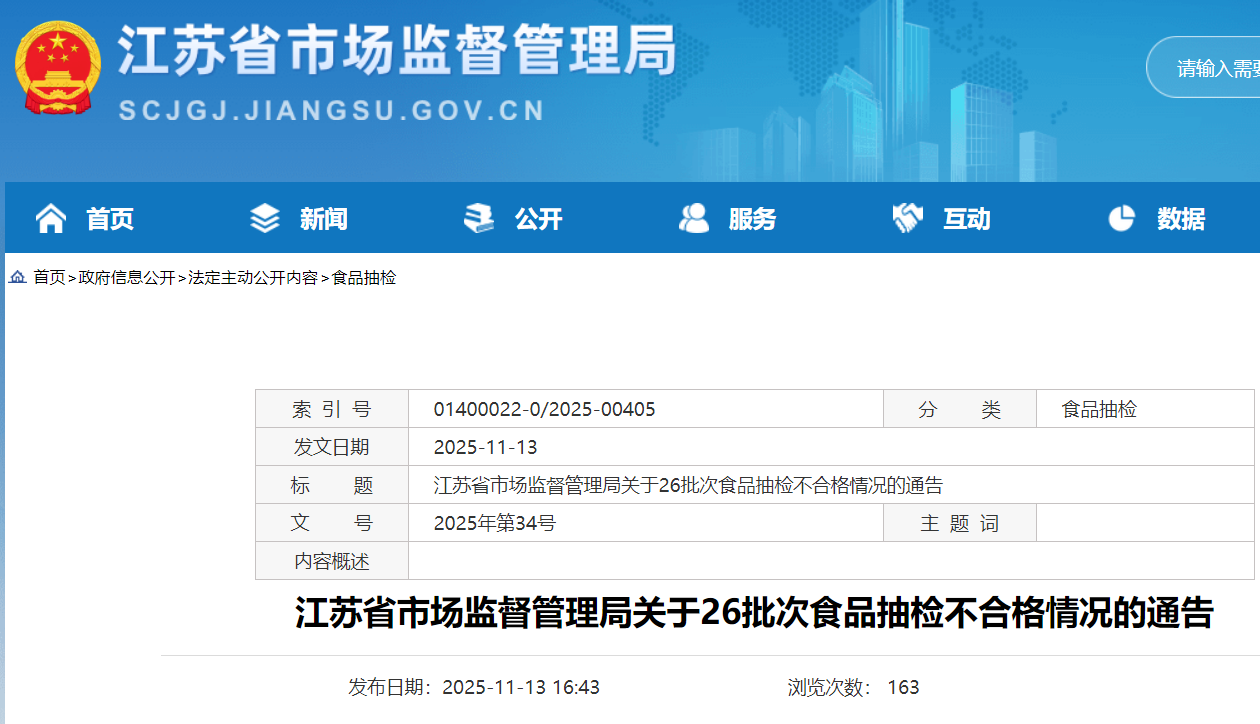 江蘇:26批次食品不合格,涉及“雙和食品”等
