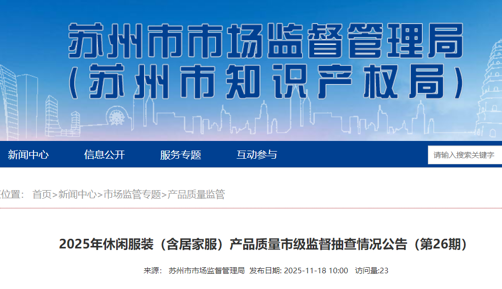 根據(jù)《中華人民共和國產(chǎn)品質(zhì)量法》、《產(chǎn)品質(zhì)量監(jiān)督抽查管理暫行辦法》、《江蘇省省級產(chǎn)品質(zhì)量監(jiān)督抽查工作規(guī)范》和《中華人民共和國政府信息公開條例》等規(guī)定,蘇州市市場監(jiān)督管理局近期委托蘇州市纖維檢驗院有限公司對休閑服裝(含居家服)產(chǎn)品質(zhì)量實施了市級監(jiān)督抽查并將有關情況公告如下: