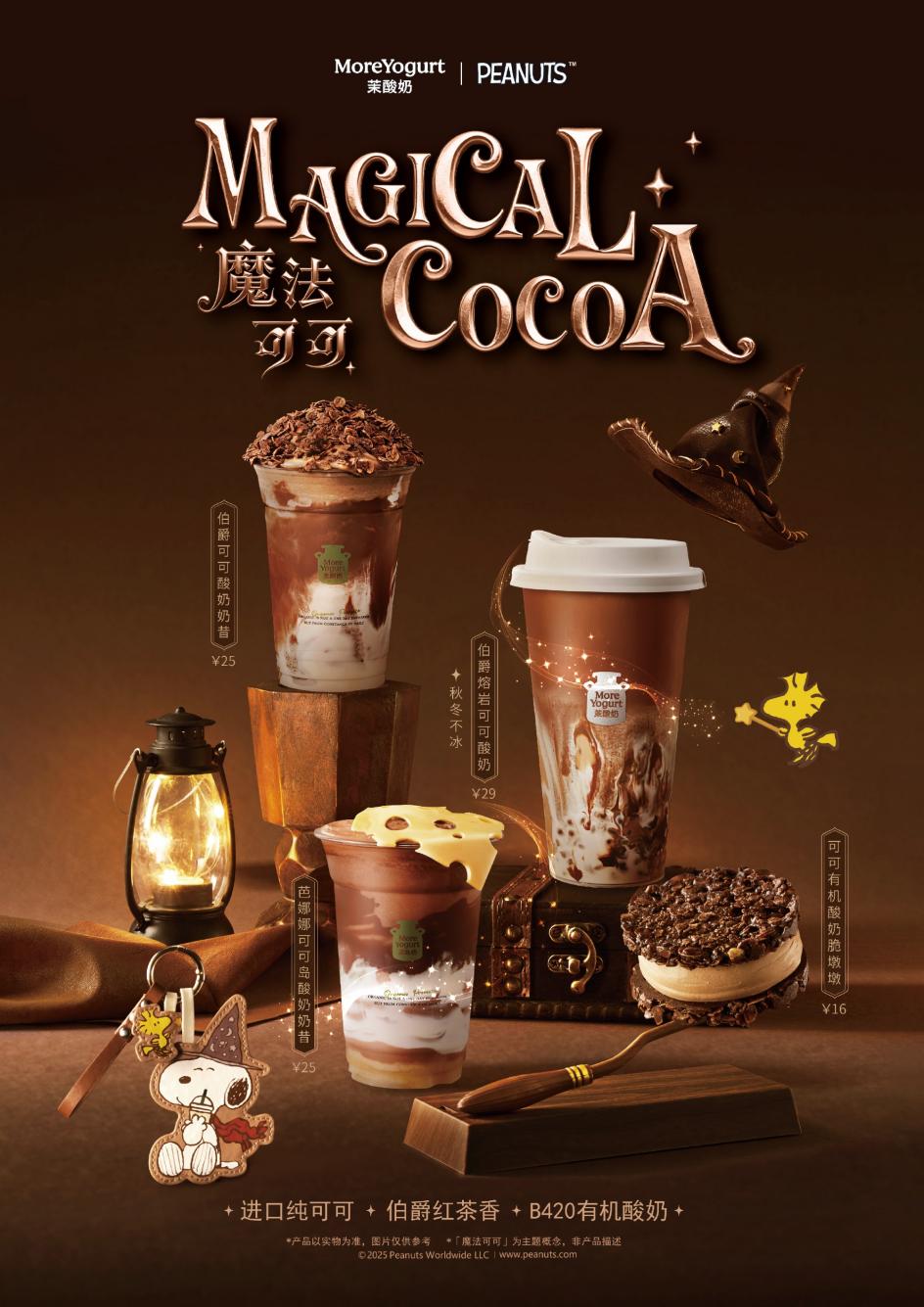 本次攜手花生漫畫,茉酸奶上新了芭娜娜可可島酸奶奶昔、伯爵可可酸奶奶昔、伯爵熔巖可可酸奶、可可有機(jī)酸奶脆墩墩等可可系列聯(lián)名特色產(chǎn)品??煽杀旧砭哂袦嘏?、治愈屬性,與秋冬氛圍高度契合,也為聯(lián)名主題“Magical Cocoa”提供了多元的產(chǎn)品支撐。