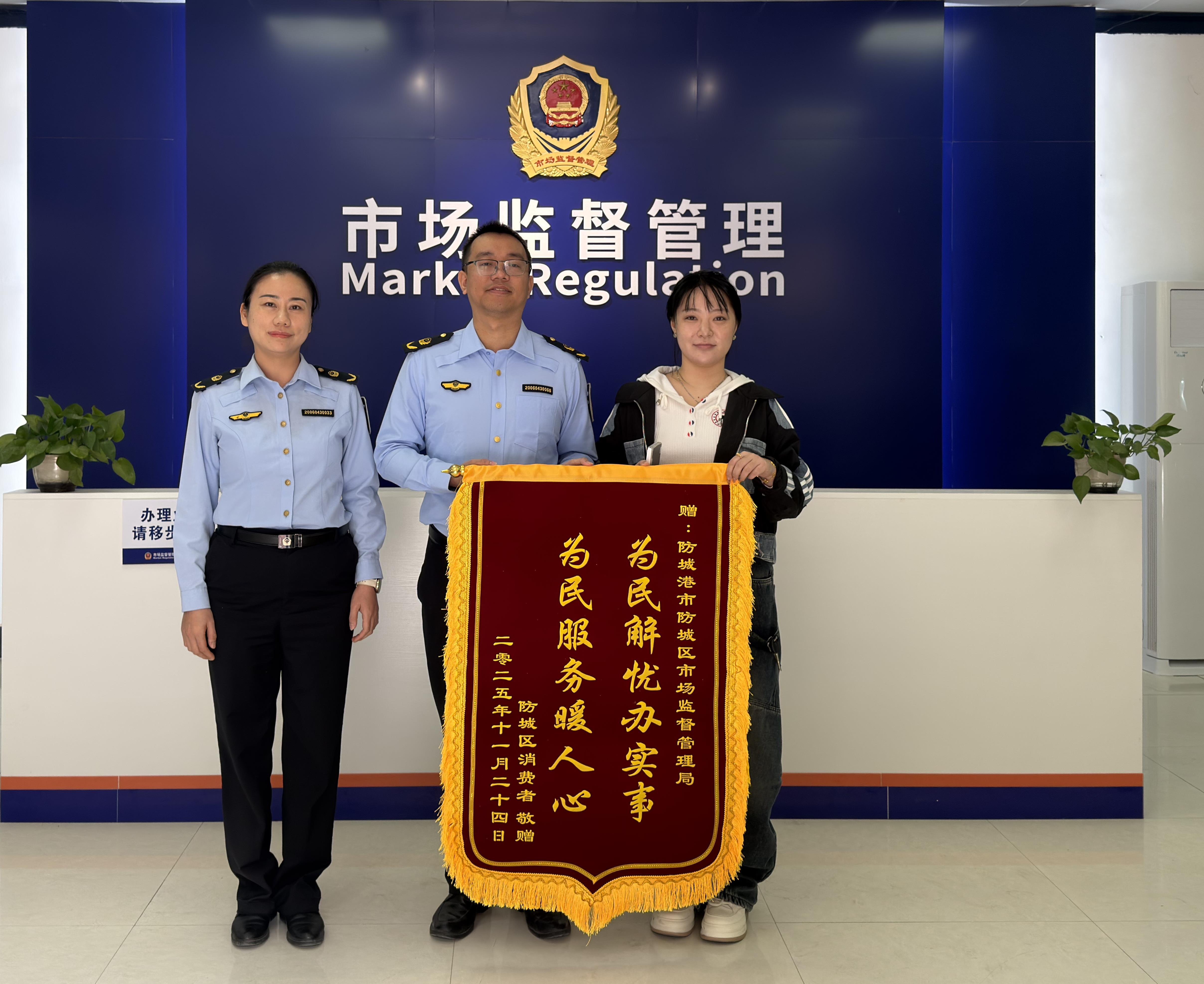 消費(fèi)者給調(diào)解人員贈(zèng)送錦旗。防城區(qū)市場(chǎng)監(jiān)管局供圖