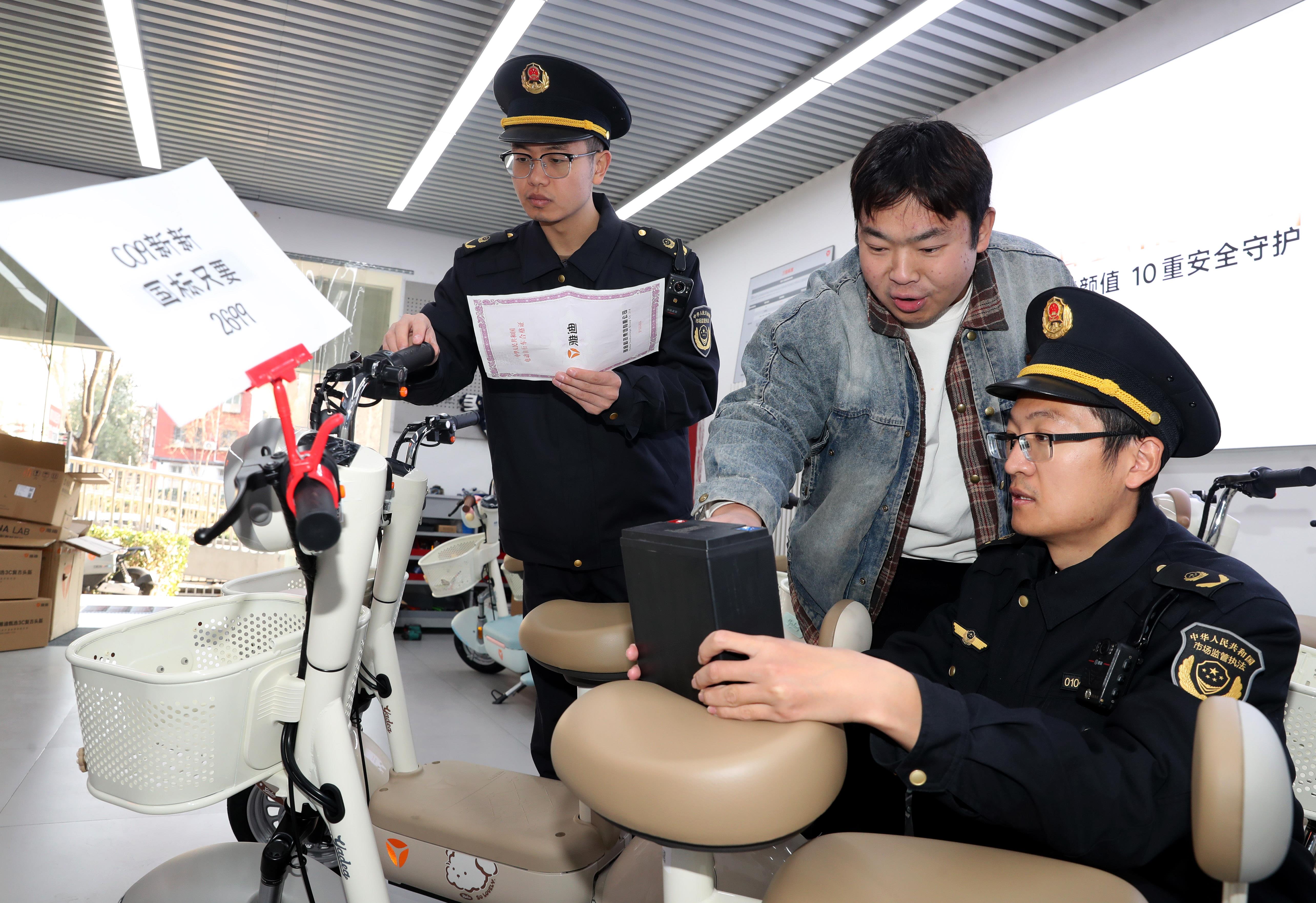 12月1日,電動(dòng)自行車強(qiáng)制性新國(guó)標(biāo)全面落地實(shí)施。連日來,北京市海淀區(qū)市場(chǎng)監(jiān)管局開展電動(dòng)自行車專項(xiàng)檢查行動(dòng),推動(dòng)電動(dòng)自行車新規(guī)落實(shí)。圖為12月5日,執(zhí)法人員檢查電動(dòng)自行車鋰離子蓄電池及其合格證明材料。