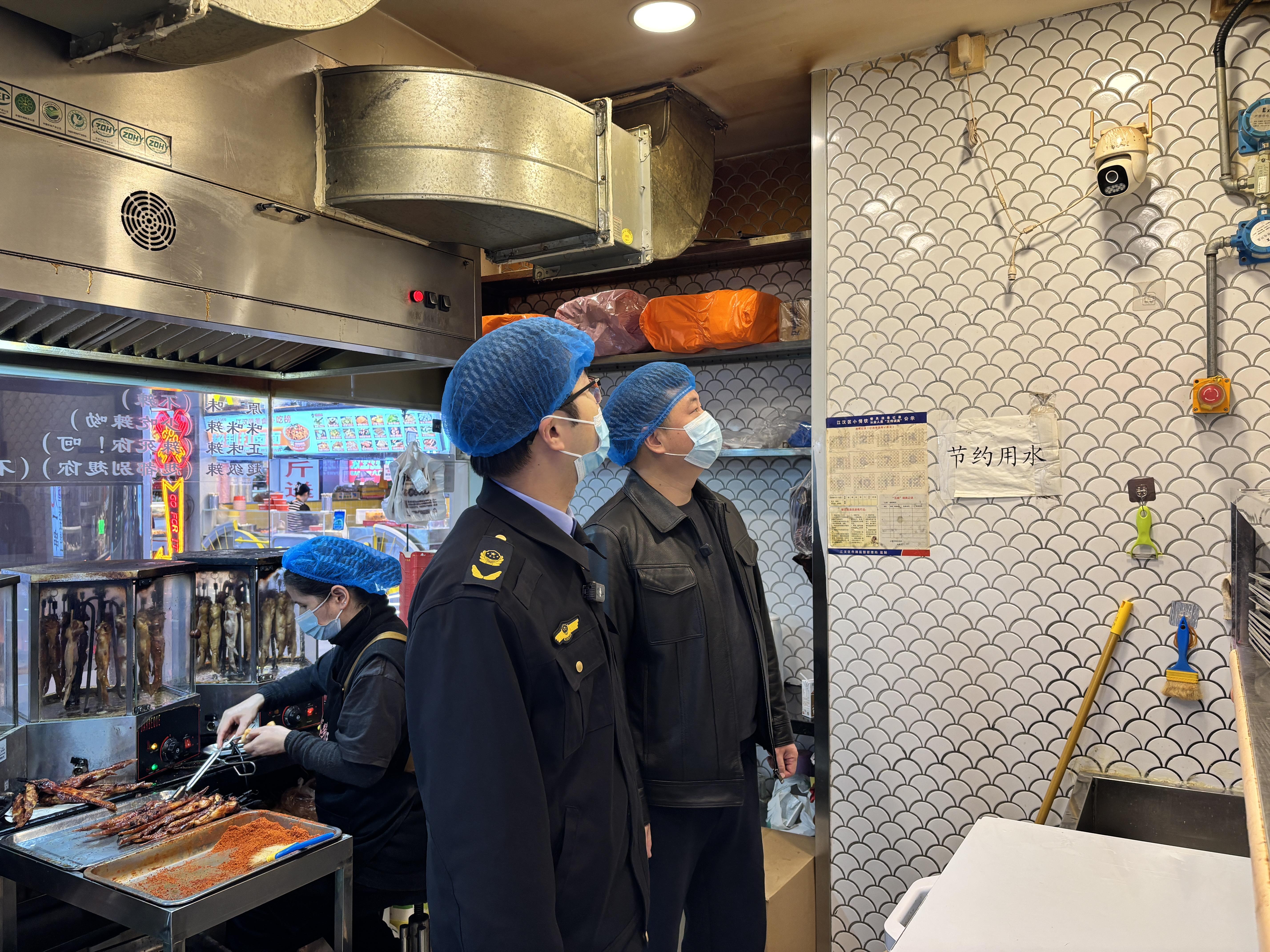 執(zhí)法人員檢查餐飲店后廚攝像頭安裝情況。吳采平/攝