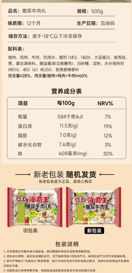 同日,在某電商超市里銷售的一款海霸王肉丸產(chǎn)品,其圖文詳情頁面品名顯示為“撒尿牛肉丸”,配料表前三位為豬肉、雞肉、牛肉,商家稱“本頁面展示的配料表為最新版”。