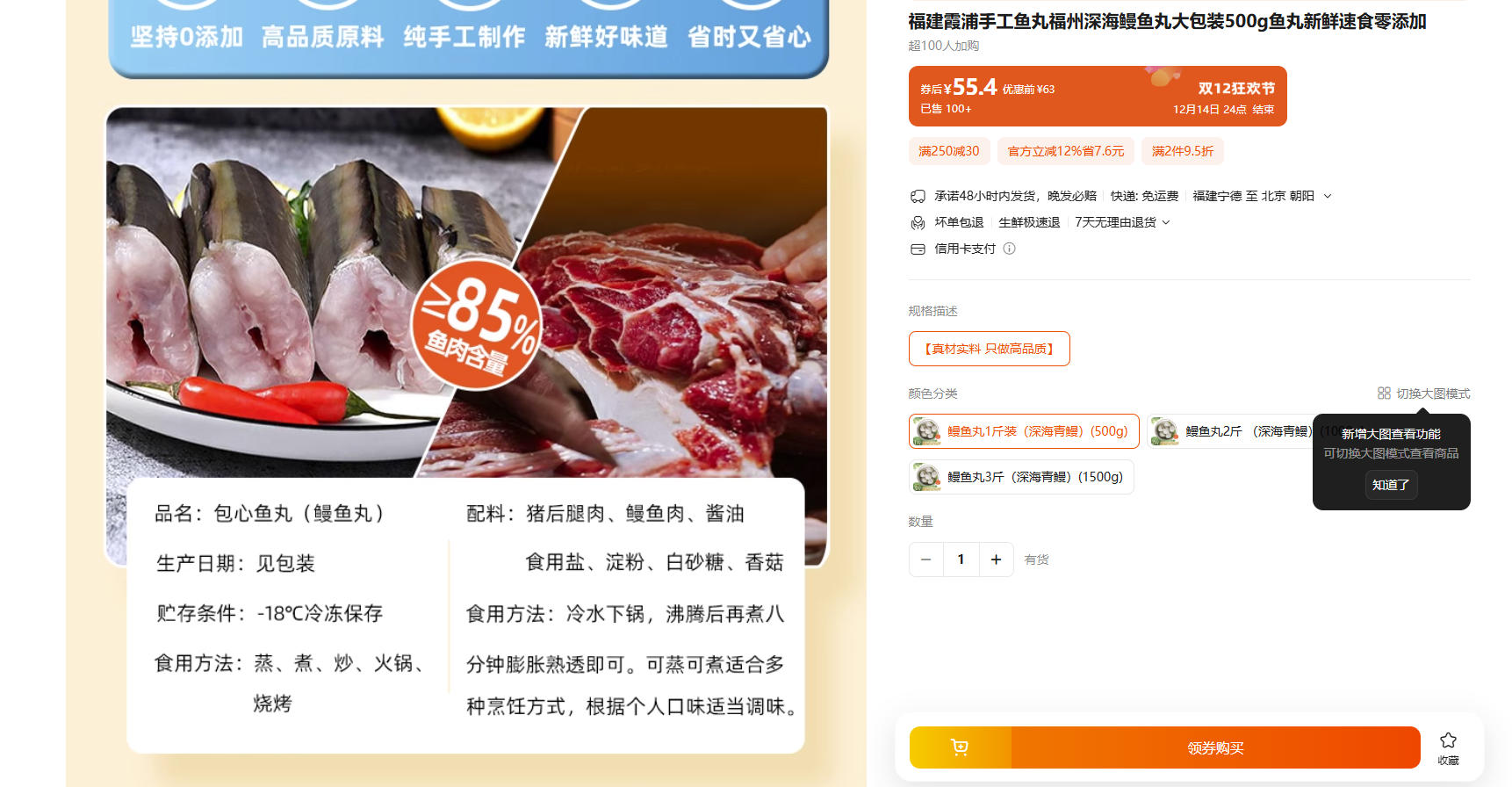 在某電商平臺上,一家名為“金玉手工魚丸”的店鋪里銷售的多款魚丸,圖文詳情頁面配料表顯示前兩位為豬后腿肉、鰻魚肉,而產(chǎn)品宣傳圖片中卻用較大字體標(biāo)注“魚肉含量≥85%”。一家名為“潮汕牛佳鮮肉丸店”銷售的章魚丸,客服介紹稱“這是咱們家的潮汕手打章魚丸,肉含量高達(dá)96%以上”,查看其配料表發(fā)現(xiàn),排在前兩位的為魚糜、章魚肉,且未標(biāo)明魚糜的成分。喜得佳旗艦店里銷售的一款“墨魚丸”,店鋪客服發(fā)給記者的配料表顯示前幾位為魚糜(魚肉、白砂糖、三聚磷酸鈉、焦磷酸鈉)、豬肉、飲用水、墨魚。泰福食品企業(yè)店里銷售的章魚丸,經(jīng)向客服核實(shí),其配料表顯示前三位為魚糜、章魚、豬肉。