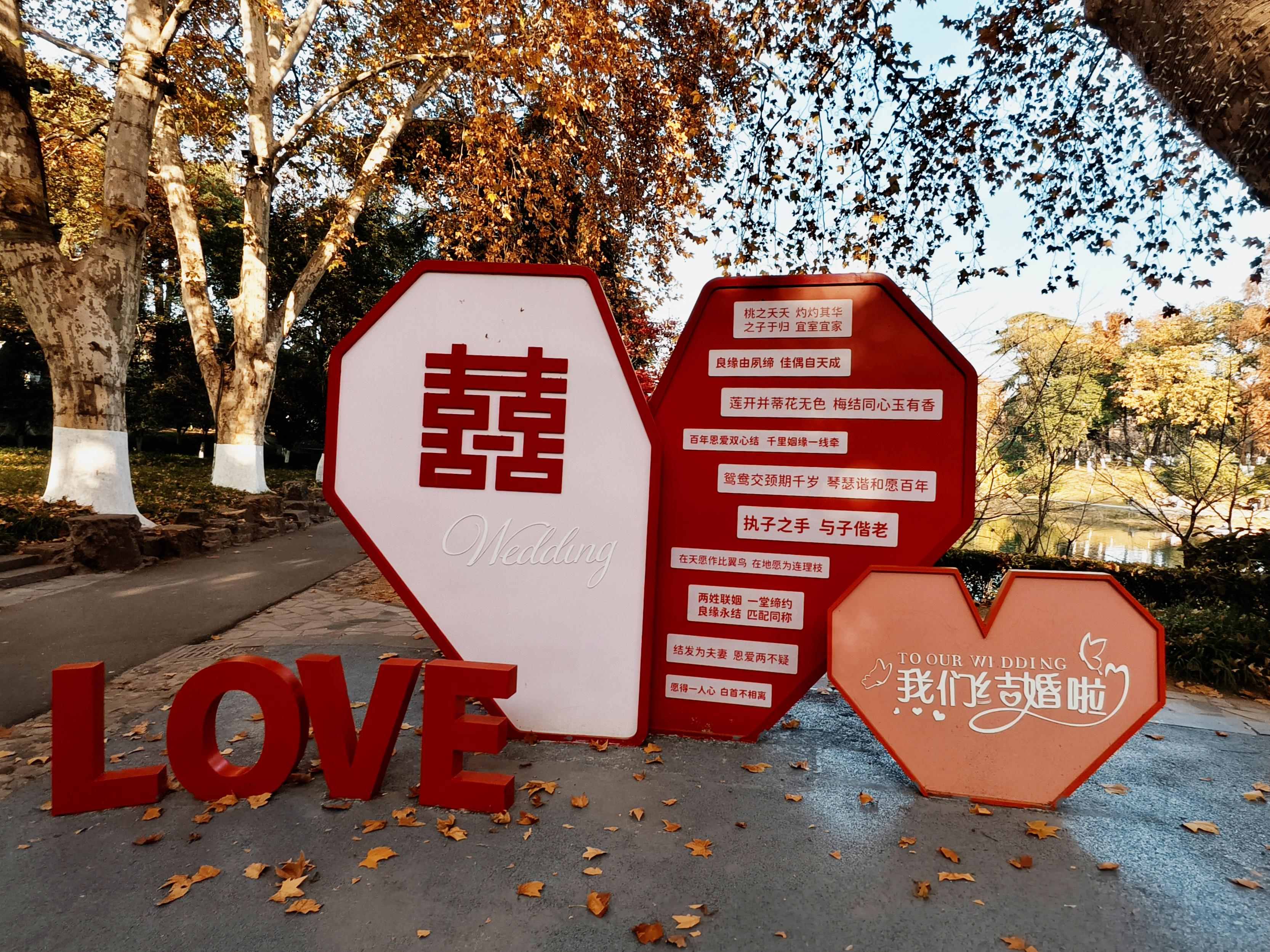 南京玄武湖景區(qū)內(nèi)的愛情宣言打卡點(diǎn)供新人拍照取景。薛晶晶/攝