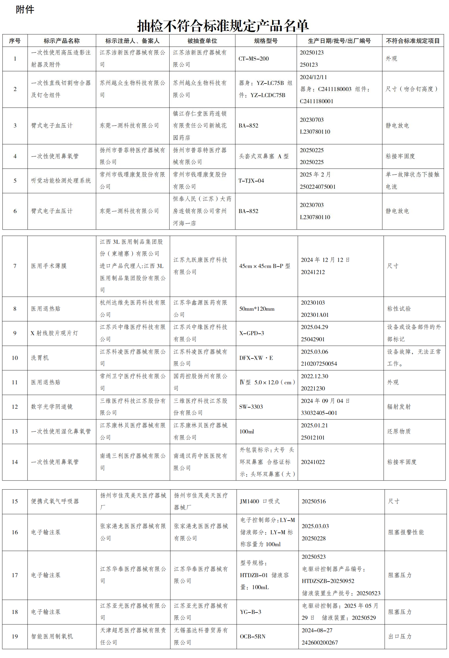 為加強(qiáng)醫(yī)療器械質(zhì)量監(jiān)管,保障產(chǎn)品使用安全有效,依據(jù)年度抽檢工作計(jì)劃,江蘇省藥品監(jiān)督管理局組織對(duì)醫(yī)療器械生產(chǎn)、經(jīng)營、使用單位進(jìn)行了抽檢?,F(xiàn)將抽檢中發(fā)現(xiàn)的19批次不符合規(guī)定醫(yī)療器械產(chǎn)品信息予以通告(詳見附件)。