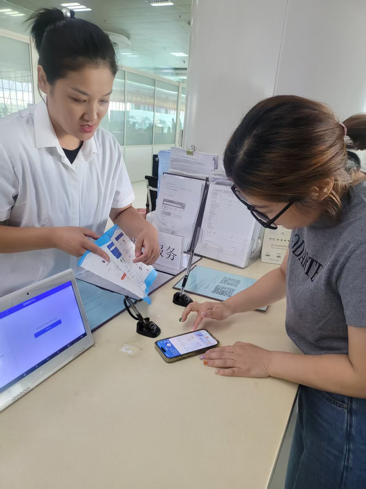 工作人員指導(dǎo)企業(yè)辦事人員下載產(chǎn)品信息通報(bào)操作指南卡。滄州市市場(chǎng)監(jiān)管局供圖