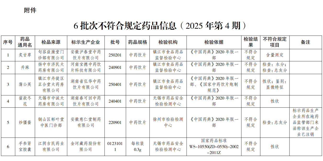 依據(jù)年度抽檢工作計(jì)劃安排,江蘇省藥品監(jiān)督管理局組織對 部分藥品生產(chǎn)、經(jīng)營、使用單位進(jìn)行了抽檢?,F(xiàn)將抽檢中發(fā)現(xiàn)的 6 批次不符合規(guī)定藥品信息予以通告(詳見附件)。 對不符合規(guī)定的藥品,我省各級藥品監(jiān)督管理部門已要求相 關(guān)企業(yè)和單位采取暫停銷售、使用等風(fēng)險(xiǎn)控制措施,對不符合規(guī) 定原因開展調(diào)查并切實(shí)進(jìn)行整改。對不符合規(guī)定的藥品,監(jiān)管部 門已依法組織開展對相關(guān)企業(yè)和單位的查處。