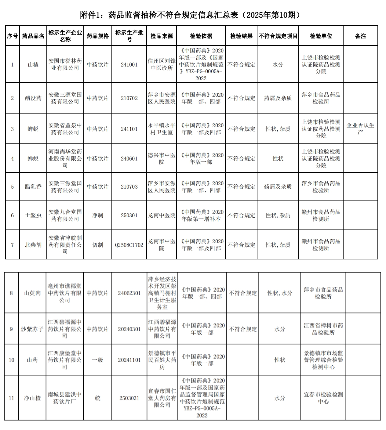附件:1.藥品監(jiān)督抽檢不符合規(guī)定信息匯總表(2025年第10期)